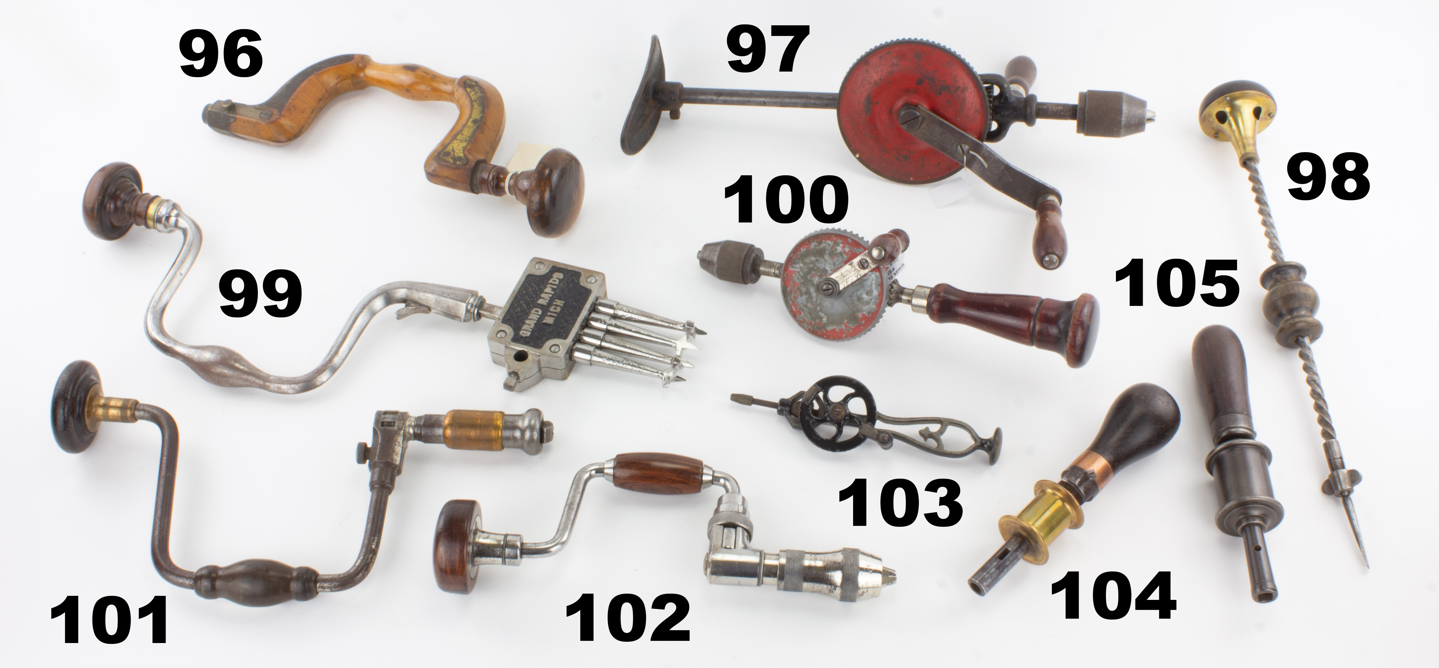 7501-101 DAVIS LEVEL & TOOL CO. ratchet brace. Early type with brass sleeve on the chuck, rosewood head and gutta percha grip. 10" sweep. Marked only with Bolen's fist patent. nickel plating gone and head has scratching; works smoothly. Good (HWM110) 40-80