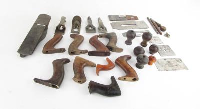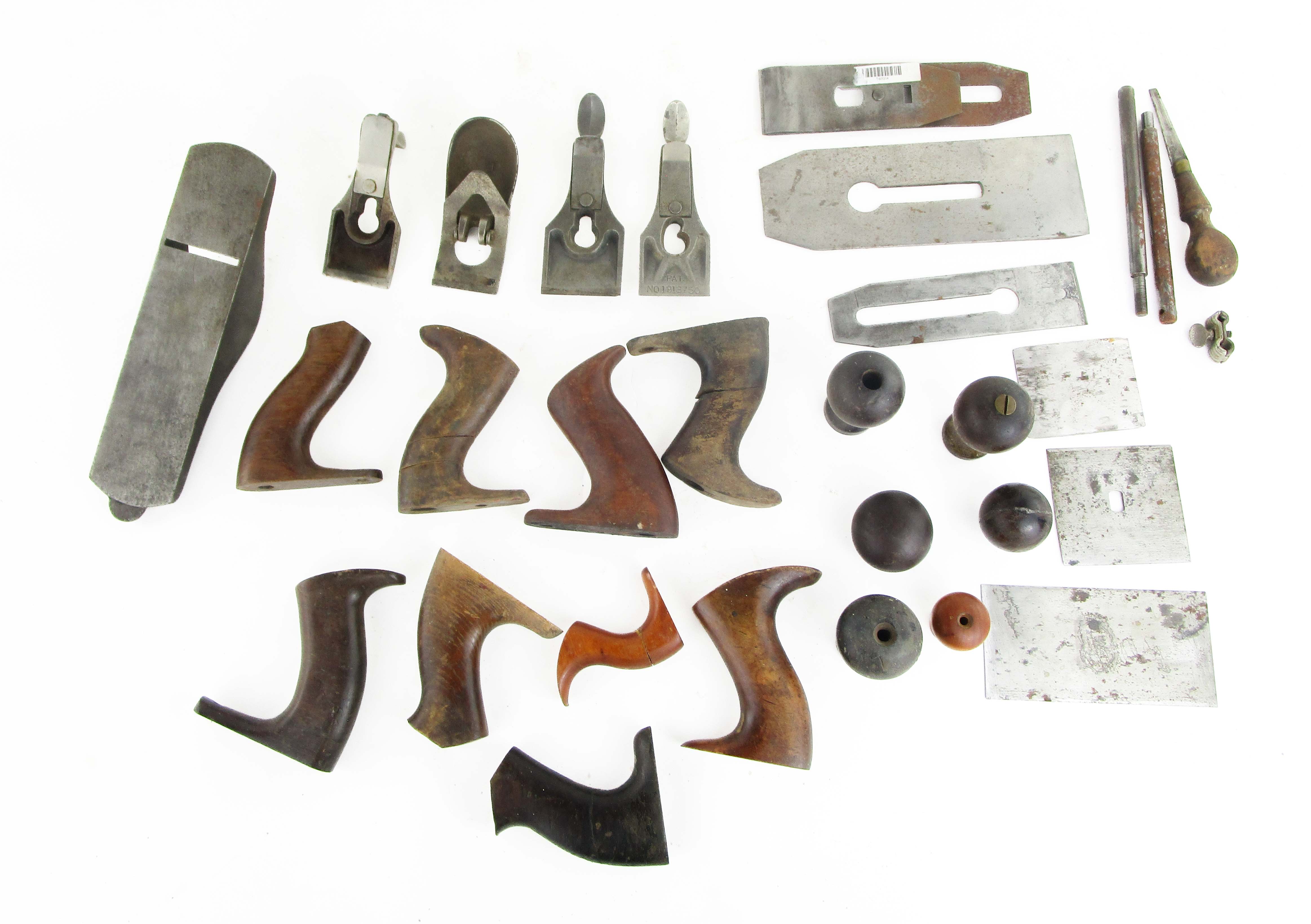 Web11-550 DEALER'S LOT OF PLANE PARTS. Includes No. 1 knob and tote, tailed block plane knob, and No. 603 body. Plus various blades, knobs, totes, and lever caps. (TWR314)