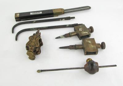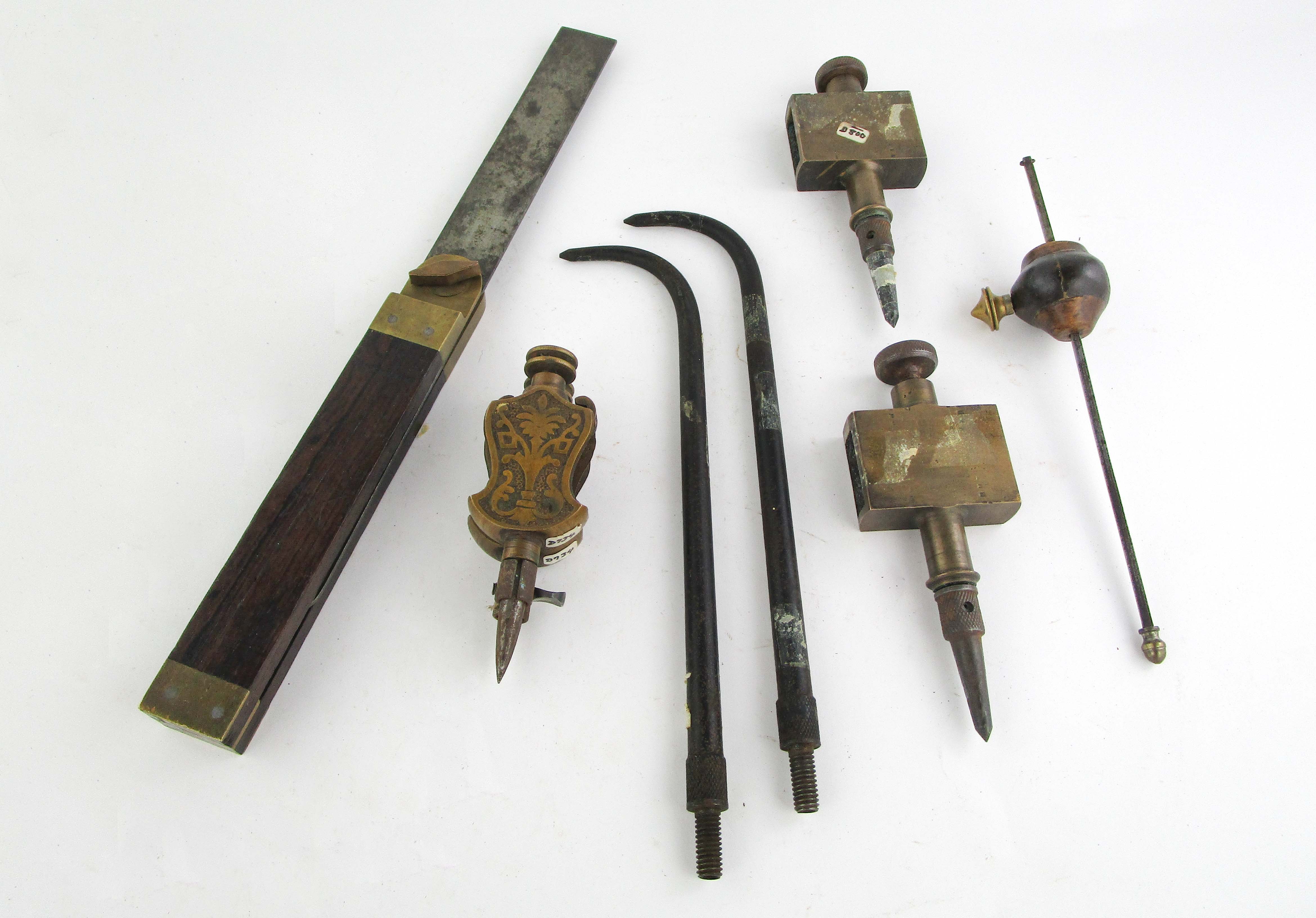 Web11-627 LOT OF MEASURING TOOLS. Star Tool bevel with 12" blade; user made marking gauge with brass nut; two sets of trammel points and two trammel point blades. (SPM3098)