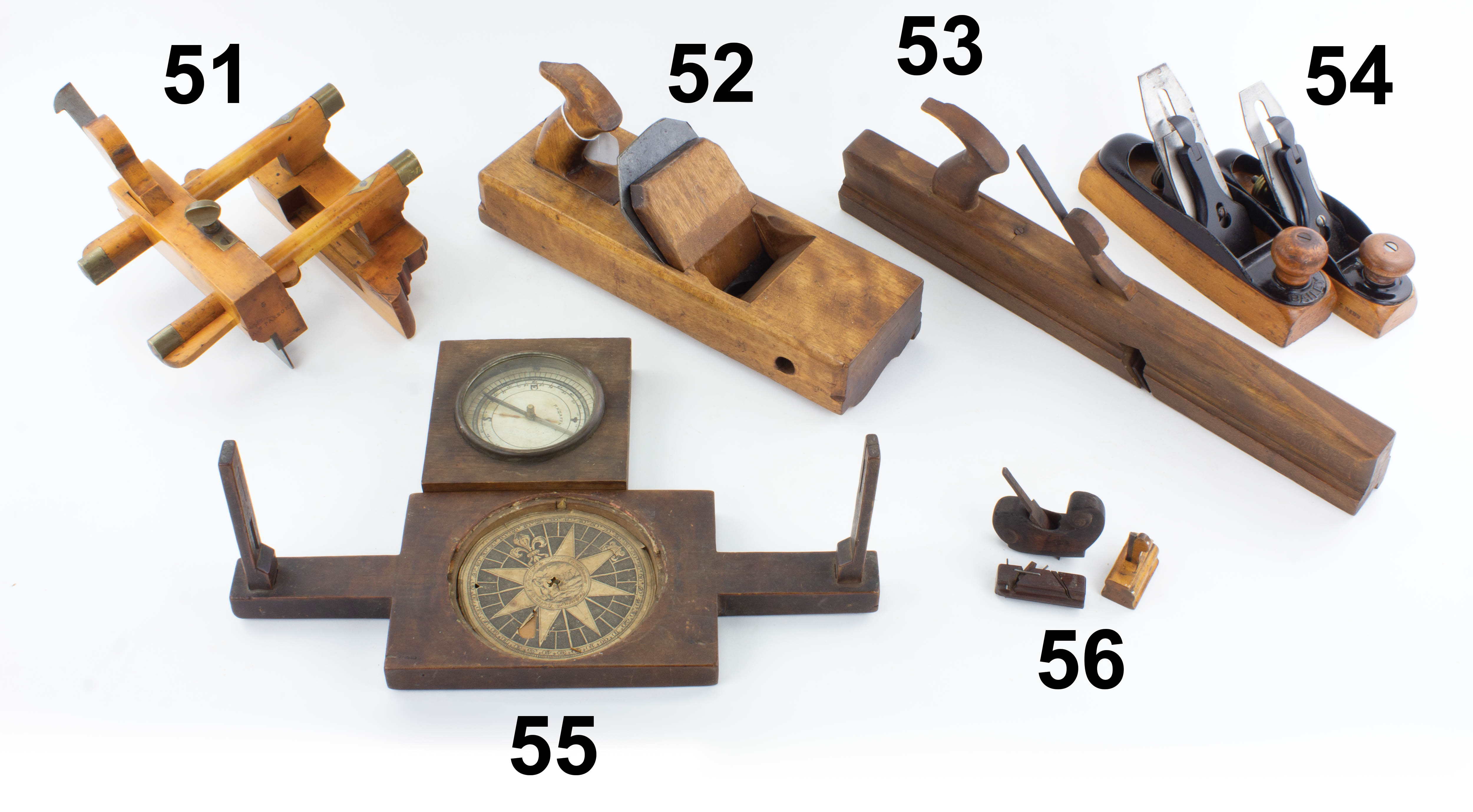 7502-55 Lot of two wooden compasses. One sighting compass marked Thomas Greenough, Boston - North England. Has sighting veins with 5" diameter paper card. Missing needle and glass dial cover. The other is marked PK Gaffney with 4" diameter dial in a 4-1/2" square wooden case. Good- & better (SPM) 75-150