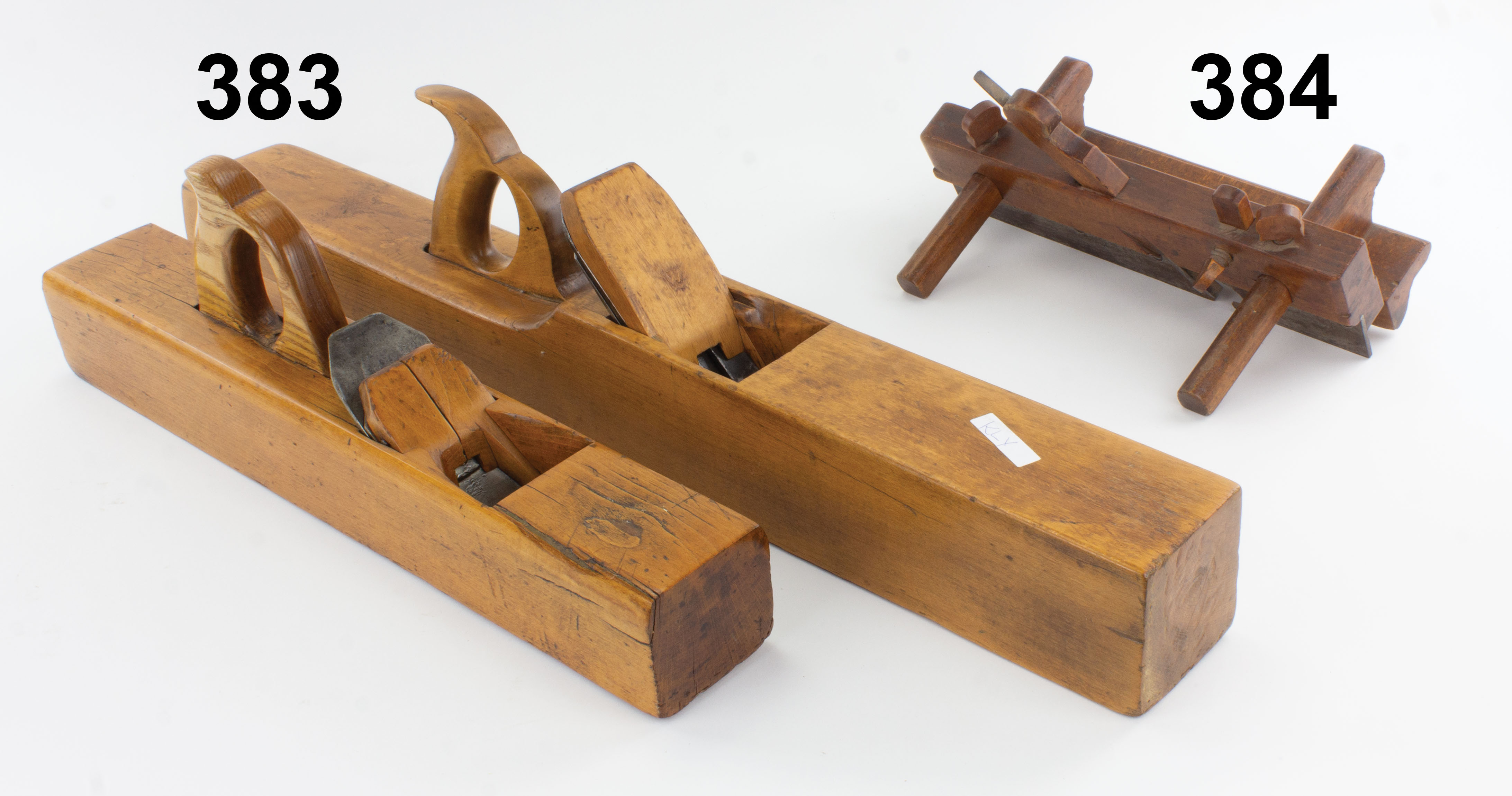 7502-383 Lot of two wooden jointers. Both unsigned. One has 29" sole and razee body, closed tote and 2-1/2" cutter. The other has a 20" body, closed tote that appears to be replacement, 2-1/4" cutter. Large split in wedge, numerous checks in both soles. Both bodies heavily lacquered. Good (KLY) 30-60