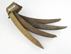* 7003-191 User made slitting gauge. Has brass wedge, square stem with slitter held by small wooden wedge, and tombstone shaped wooden head. A little over 6" long total, some wear and dinging to wood, large old chip near slitter. Good 20-40 (MGE118)