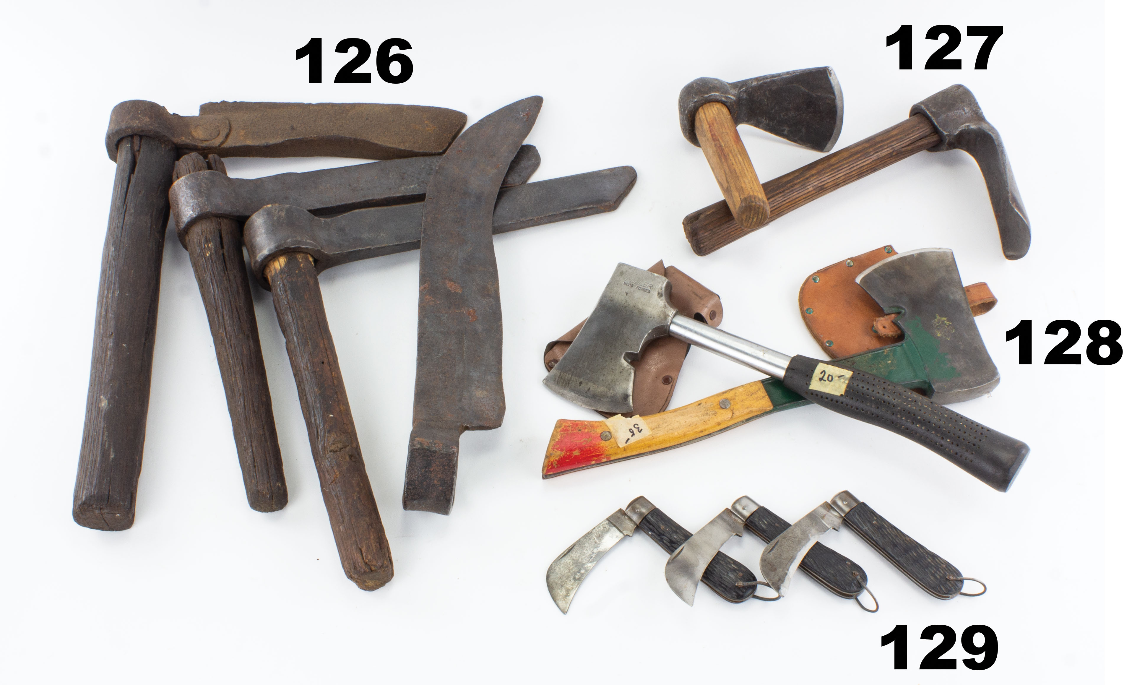 7501-128 Lot of two hatchets. Both with 3" edges. One by BRIDGEPORT with solid steel shaft and wooden handle, Boy Scout "Be Prepared" eagle mark and Bridgeport stamped into head. And a FULLER No. 16 with steel shaft and rubber handle. Both have original leather sheaths. Overall wear but undamaged. Good & better (HAN1087) 75-150