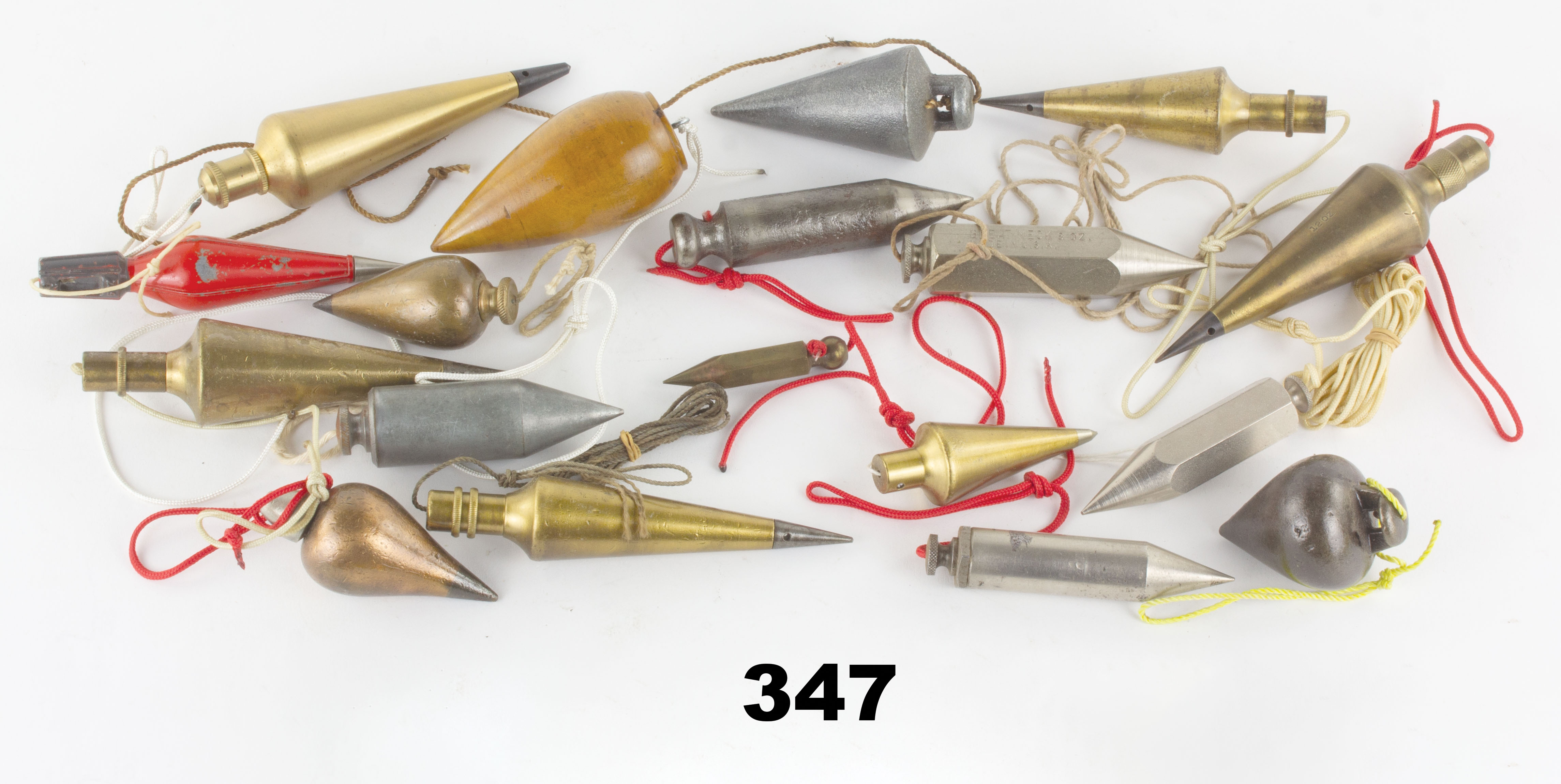 7501-347 Dealer's lot of plumb bobs. 18 total made of wood, brass, and cast iron, 5-1/2" to 2-1/2" lengths in various shapes and different makers. Overall clean. As is, no returns. Good & better (WHE401) 100-200