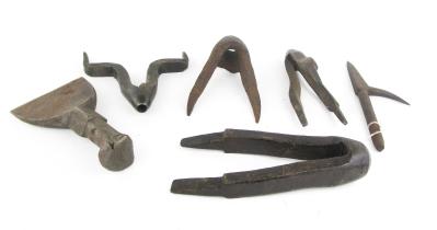 Web11-185 DEALER LOT OF CAST IRON TOOLS. 4" to 8" lengths. A 4" hoop driver and a log peavy end by Champion T&H Wworks of Everett, MI; CAST IRON DIVIDER, AND FOUR LEATHER PUNCHES. (SPM3142)