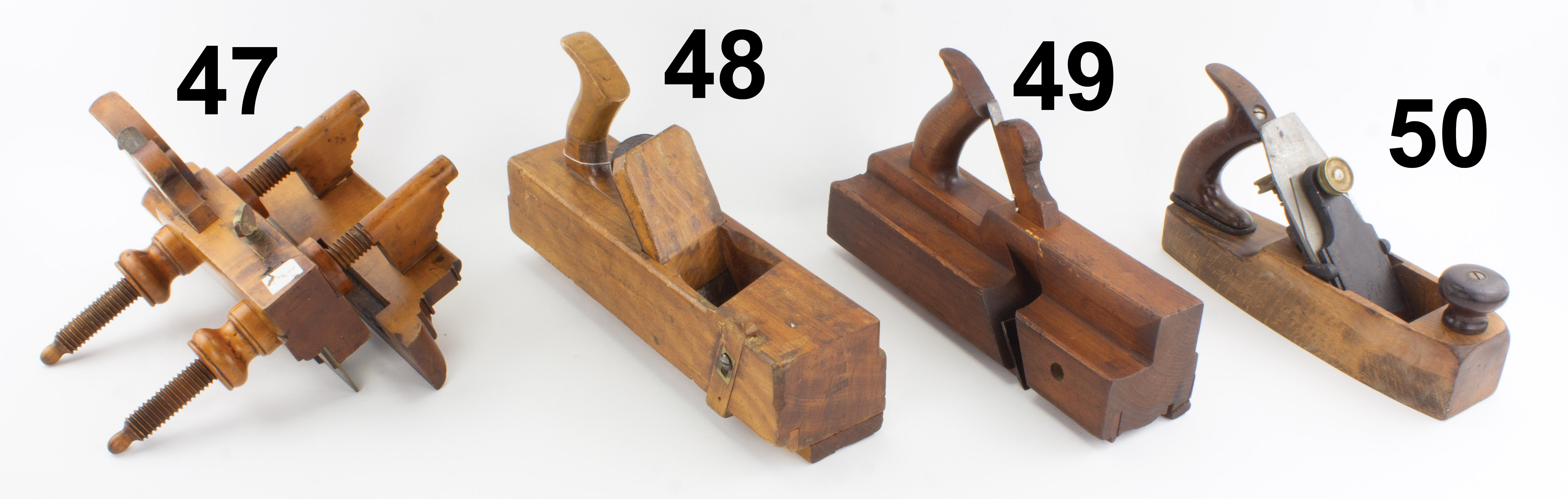 7502-48 I. COX panel raiser. 13-3/4" sole, sliding fence, single boxing strip with cracks. 2-3/4" Hildick skew cutter. Open tote has crack, wood has overall moderate wear. 18th century British maker. Good (BLY256) 50-100