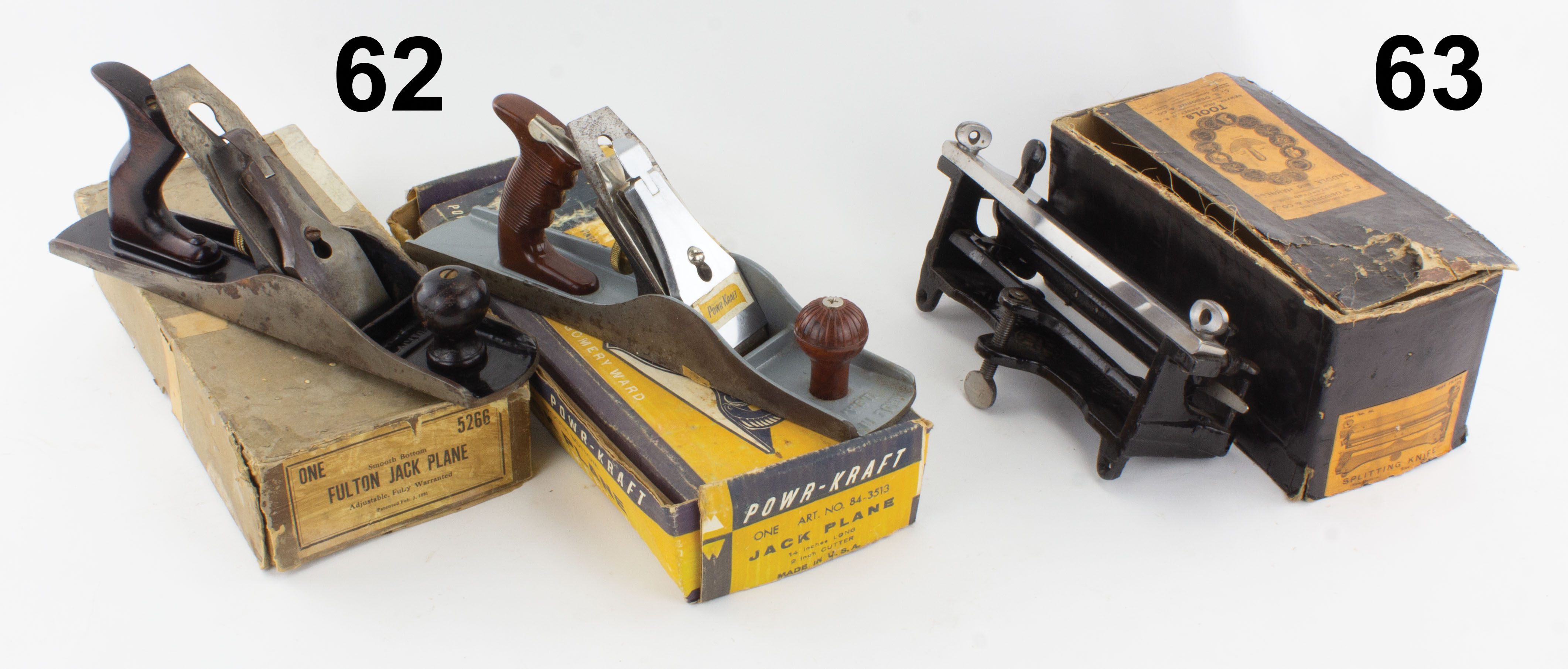 7502-62 Lot of two jack planes IOB. FULTON No. 5266 jack plane, box is complete with taped joints and good label, mild wear. The other is a POWR-KRAFT No. 84-3513, box has wear and dirty. Both planes have significant surface corrosion and both boxes have a few taped joints. Good (HUH726) 30-60