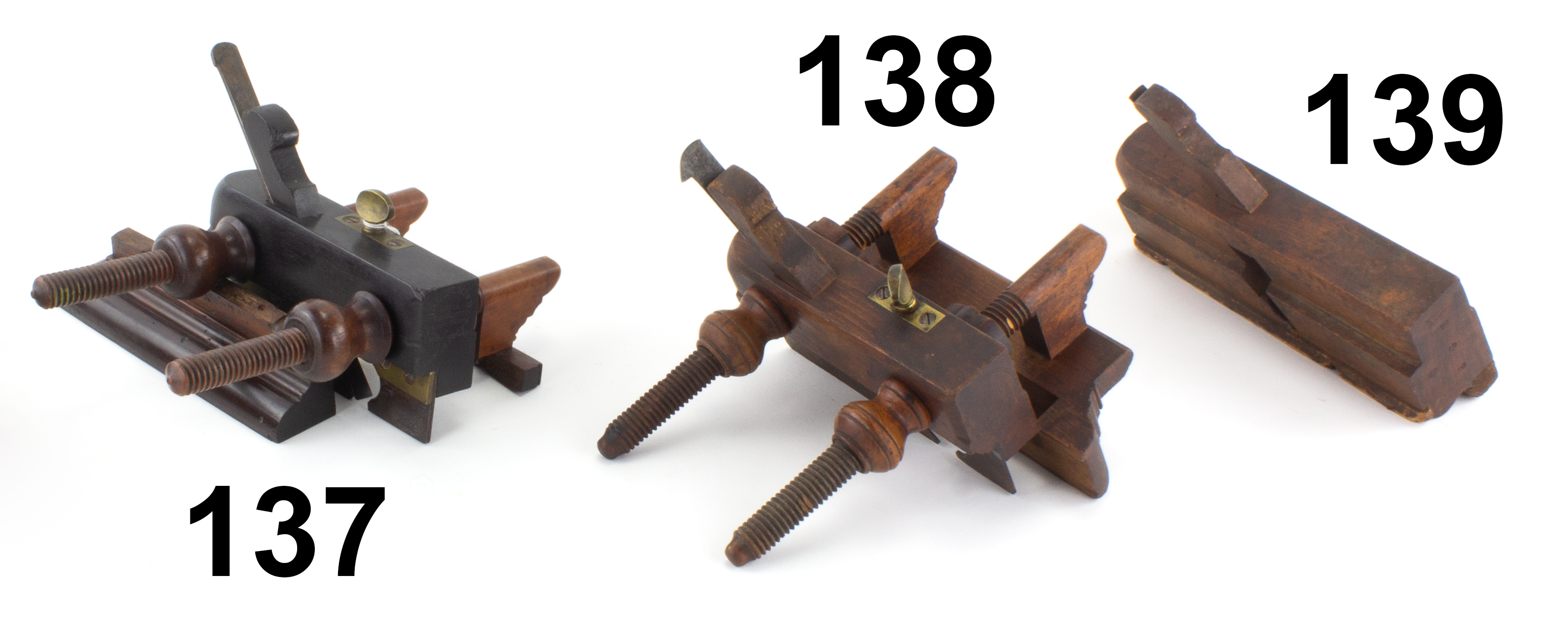 7502-138 ISRAEL WHITE unhandled screw arm plow plane. Beech throughout, light chipping to threads, wood has moderate wear and staining. White's B mark with James Silcock journeyman stamp (one star). Good (SLR541) 60-120
