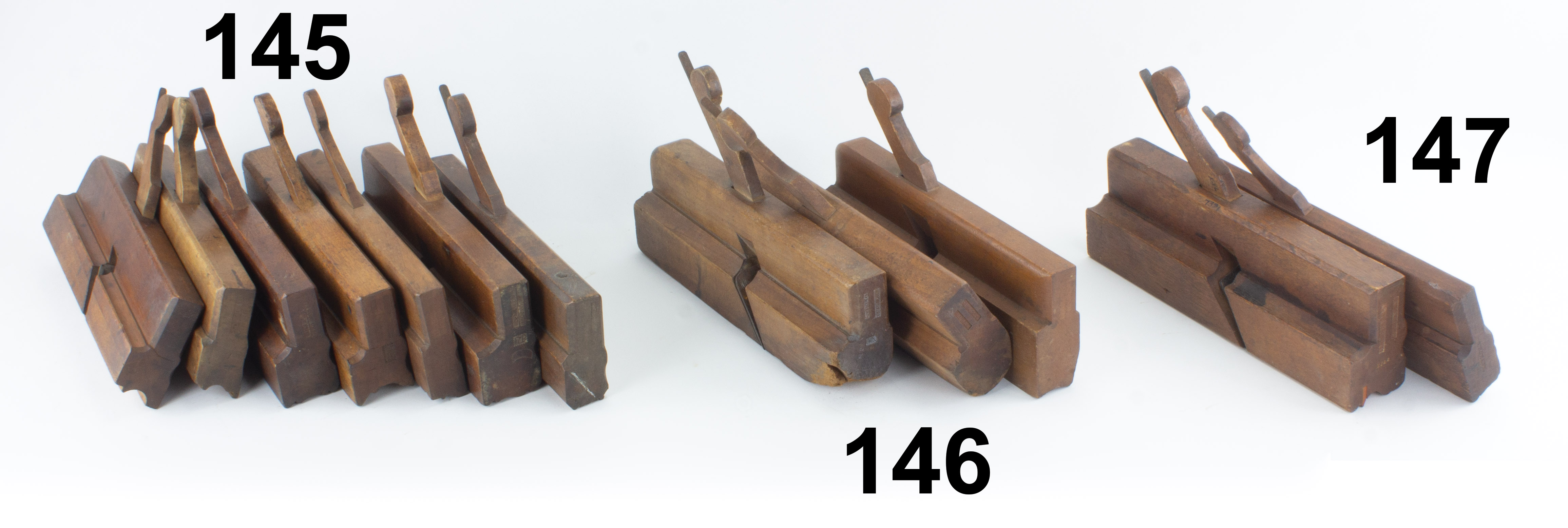 7502-147 Lot of two A. SMITH molding planes. One 1/4" center bead and one 1" quirk ogee with boxing strip that has small piece broken. Both have relieved wedges and flat chamfers. Wood has overall light wear. Good (PLH4024) 75-150
