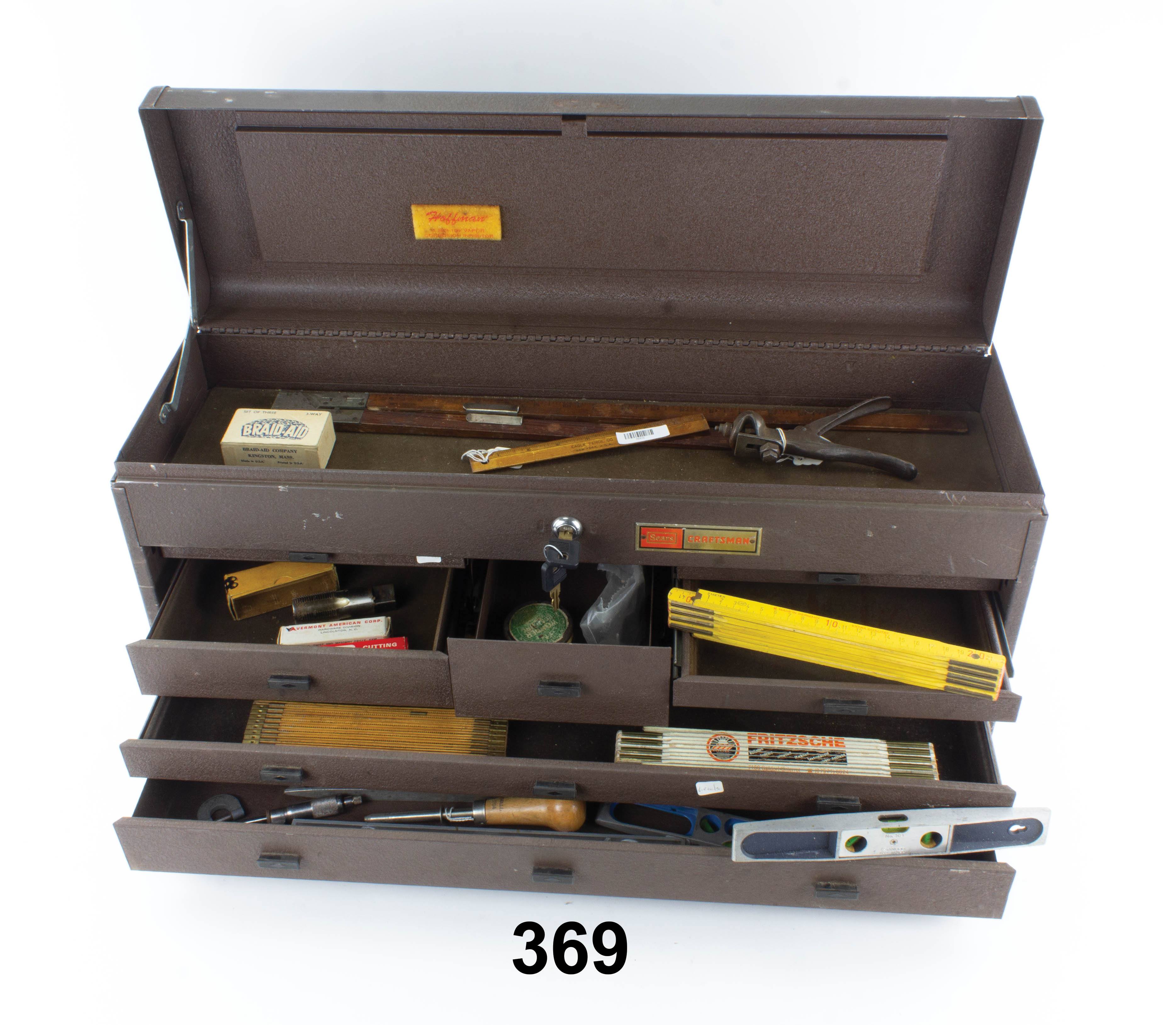 7502-369 SEARS CRAFTSMAN metal tool box. 27" by 8-1/2" and 13-1/2" high. Top compartment plus nine drawers. Front panel is loose. Steel construction with Brown finish. Includes working lock with key. Lot includes several rules, small levels, calipers and other small measuring tools Good (RER10) 100-200