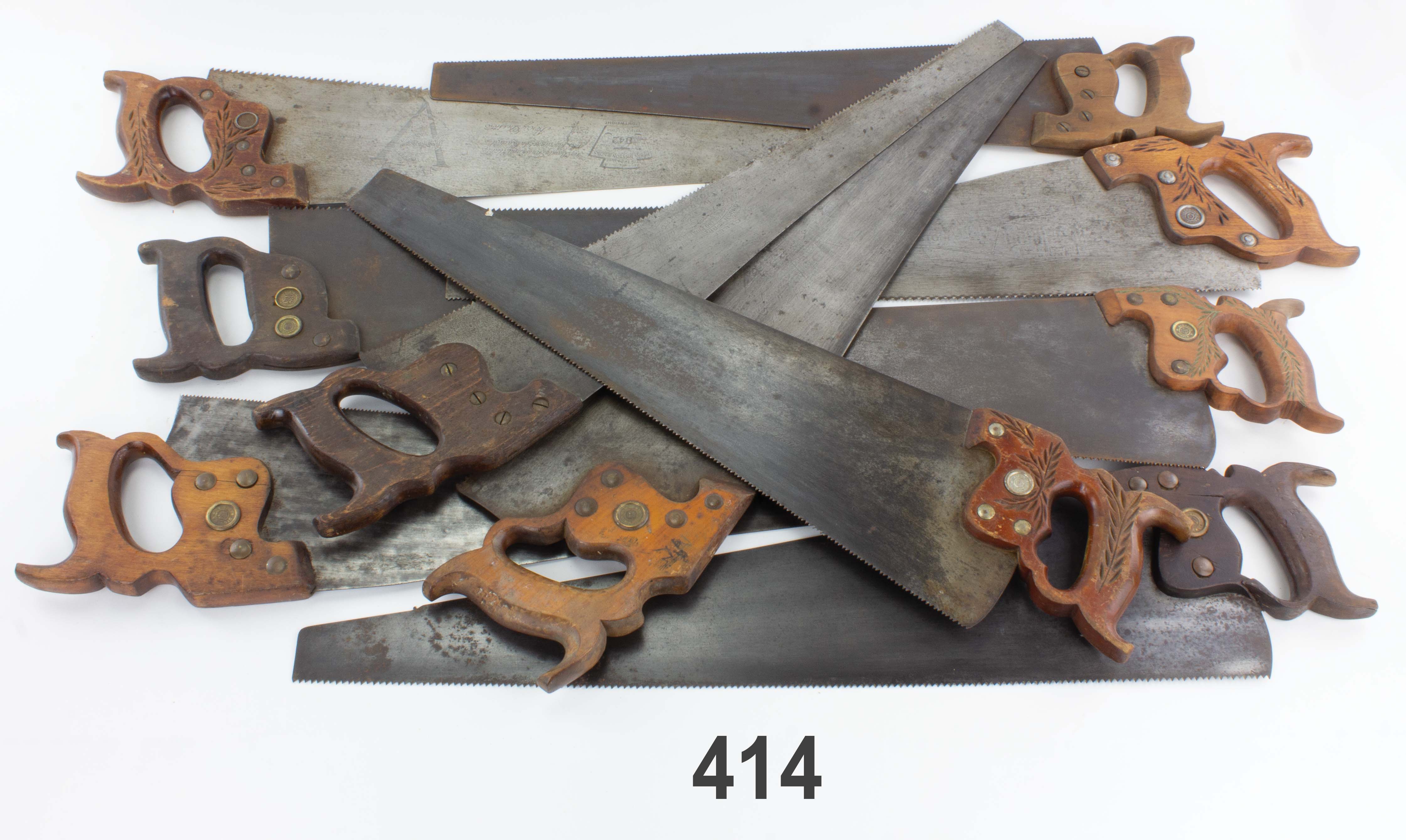 7502-414 Dealer's lot of hand saws. Ten total, eight are DISSTON including D-8, D42, and Keystone, some have surface rust and faint etches that are illegible, some have had blades cleaned with grinder. Plus one that has both Atkins and Disston nuts but no discernible etch or stamp and one with Stokes Loder Co. etch, No. 1902. Handles have varying degrees of wear and damage. Blades generally between 24" to 26". As is, no returns. Various (FBN061, 070) 50-100