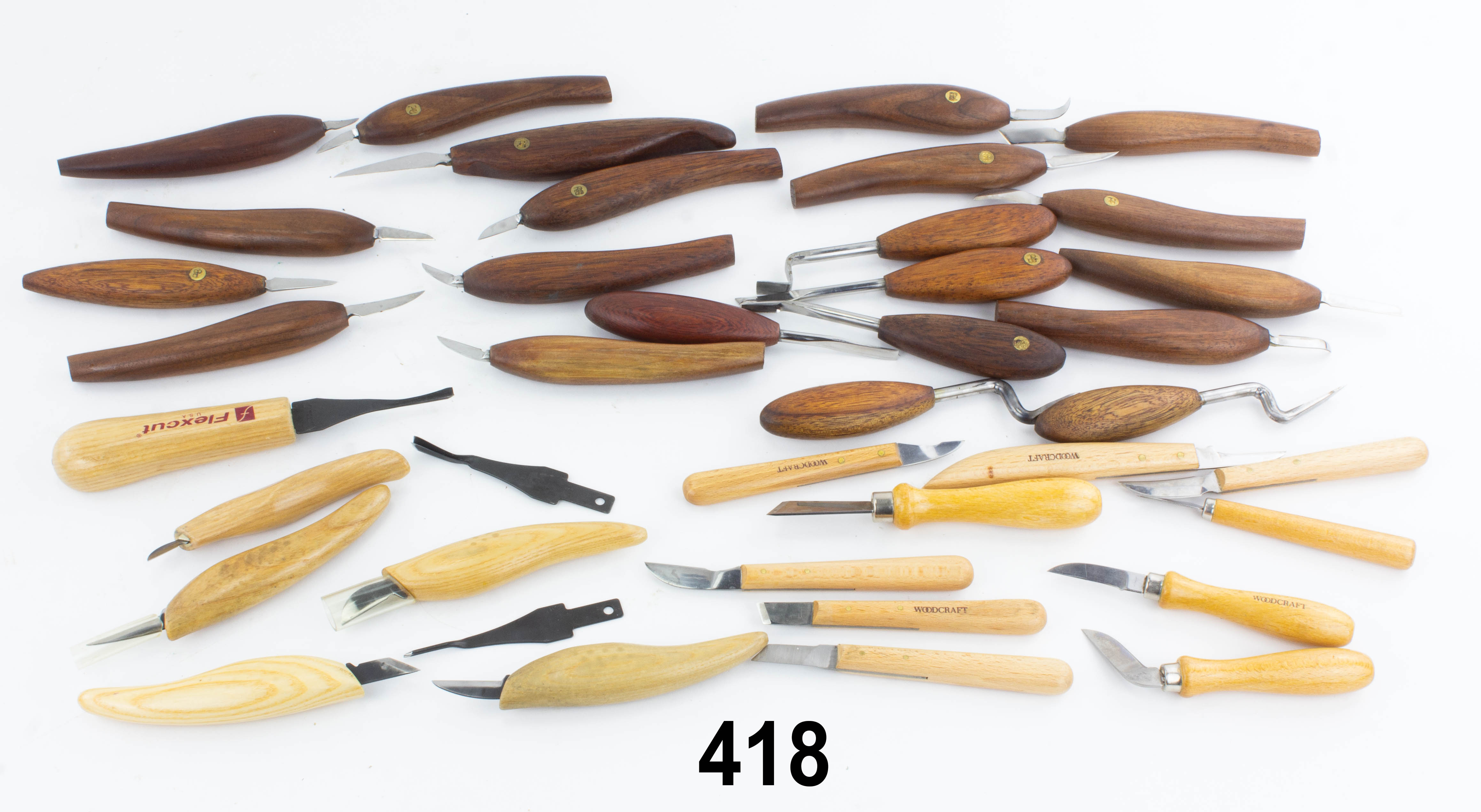 7502-418 Dealer lot of cutting and carving tools. Two different makers; 20 with dark wood handles with brass P8 circle inlay that are unmarked. The rest by FLEXCUT, 14 total with ash handles. All clean and sharp. Good+ (KLY035) 100-200