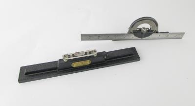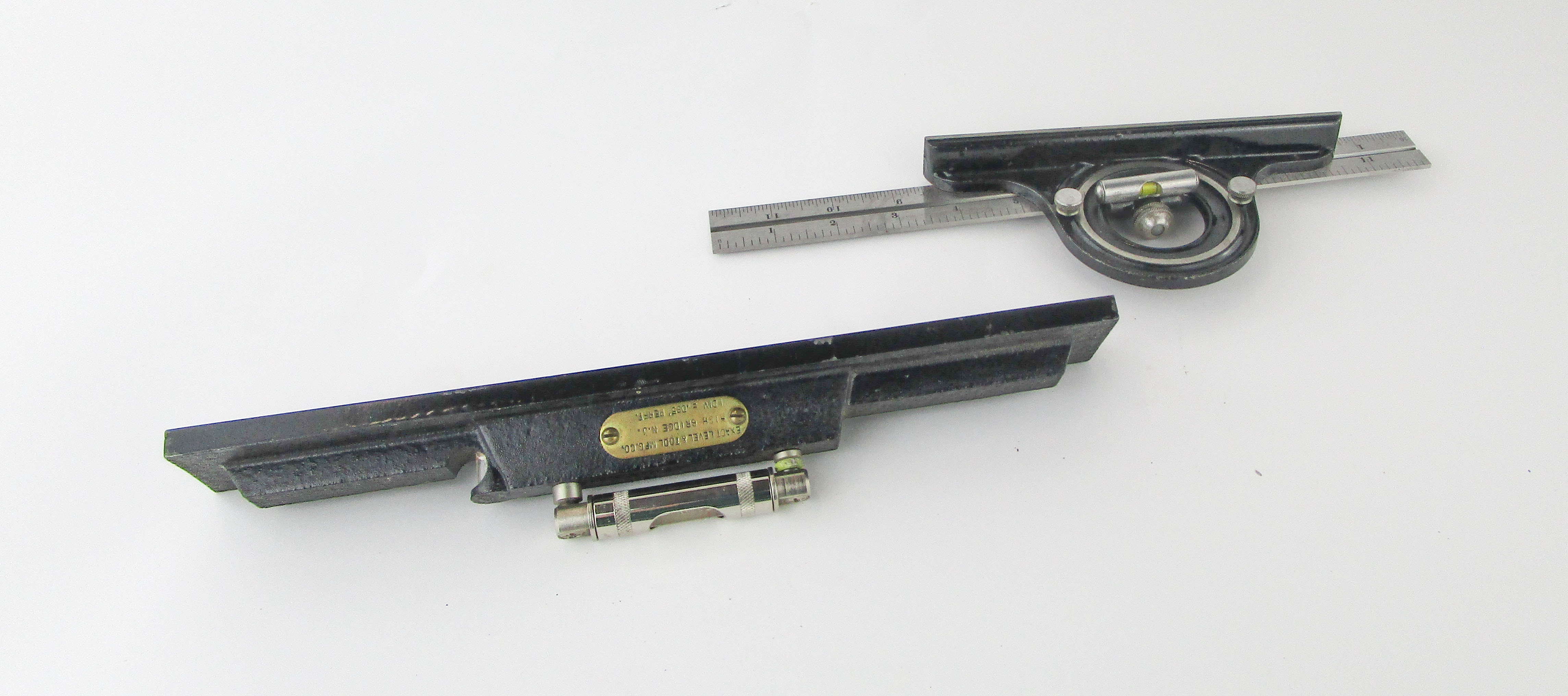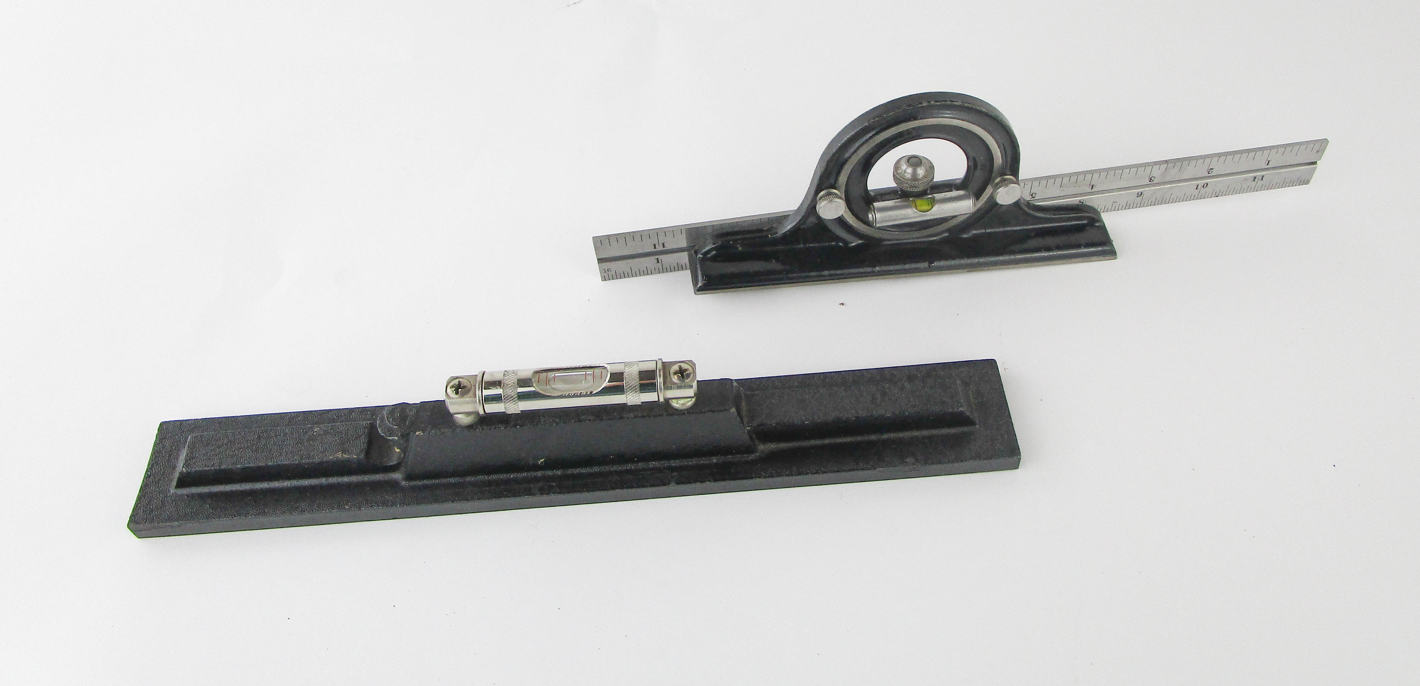 WEB12-125 LOT OF TWO MEASURING TOOLS. One level with a decorative cast iron base from Exact Level Mfg. Co., 12" and vials good, And a Starrett steel rule with a Union Tool Co. protractor head. (BLY541)