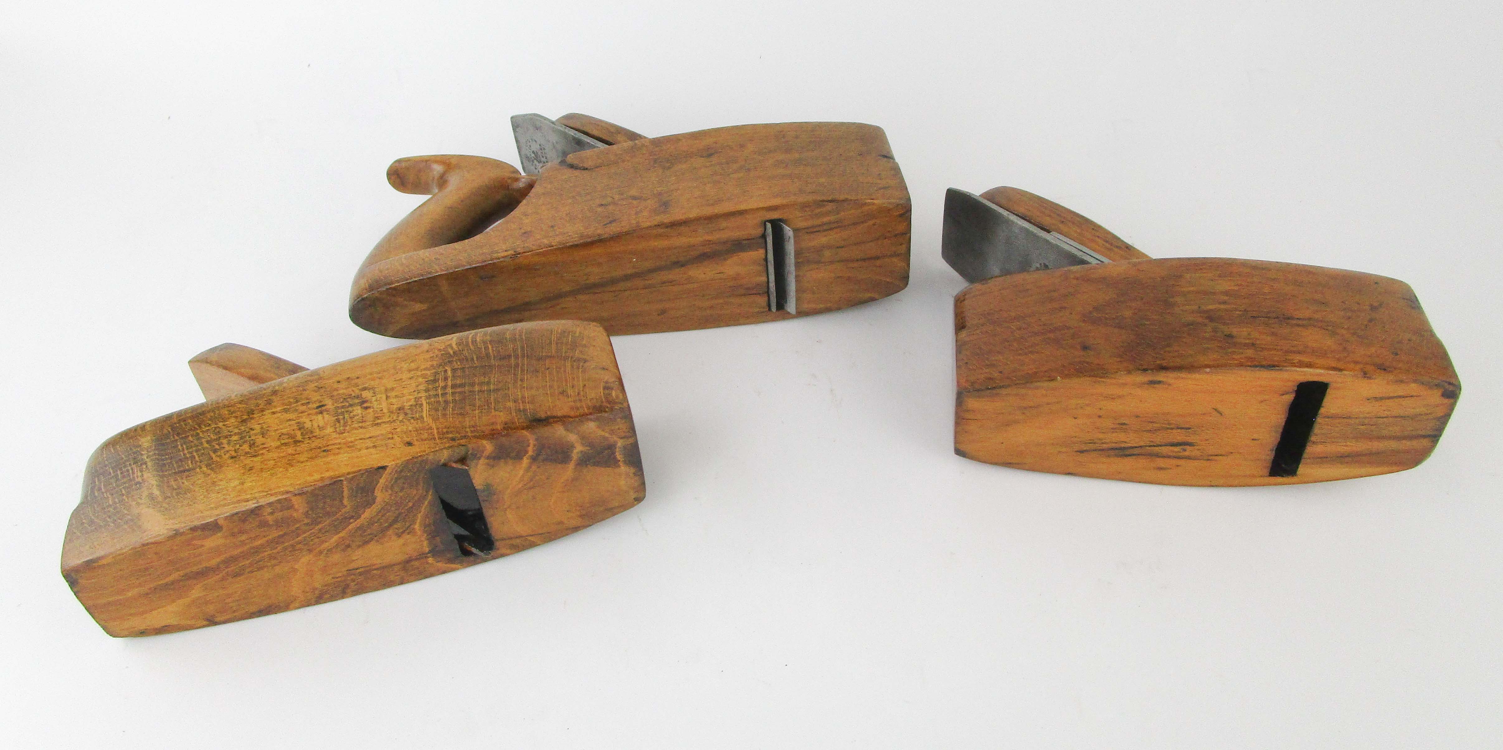 WEB12-143 LOT OF THREE WOOD COFFIN PLANES. All unmarked. One missing cutter and 8" sole; One handled with 10" sole and 2" cutter; and coffin plane 7-1/2" sole with 2-1/4" Sandusky Tool Co. cutter. (BLY490)