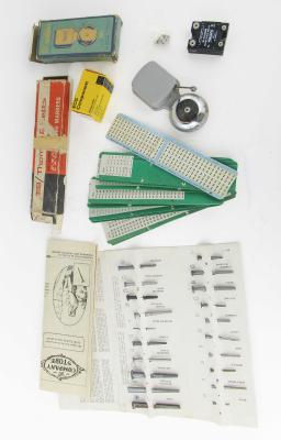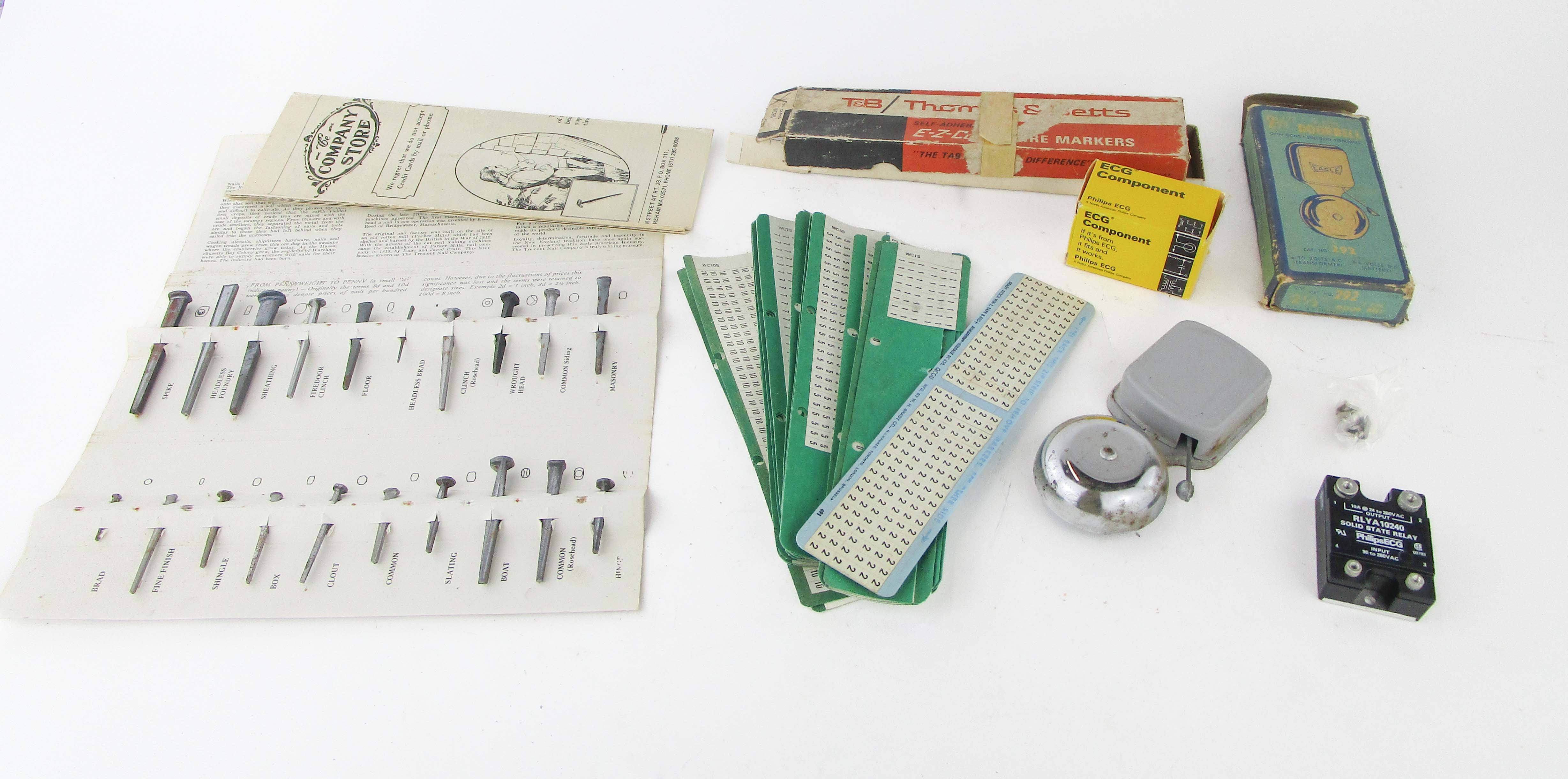 WEB12-161 LOT OF FOUR ITEMS IOB. . Eagle Electric Mfg. Co. Doorbell No. 292, 2-1/2"; ECG component; T&B special made markers, 20 total; and old fashion cut nails by Tremont Nail Co. (BLN034