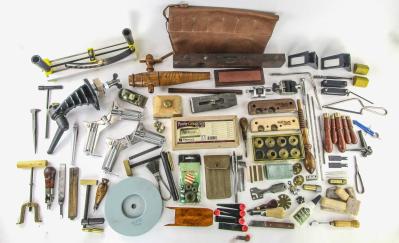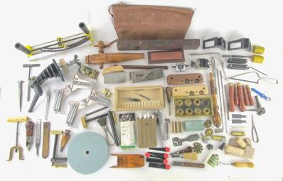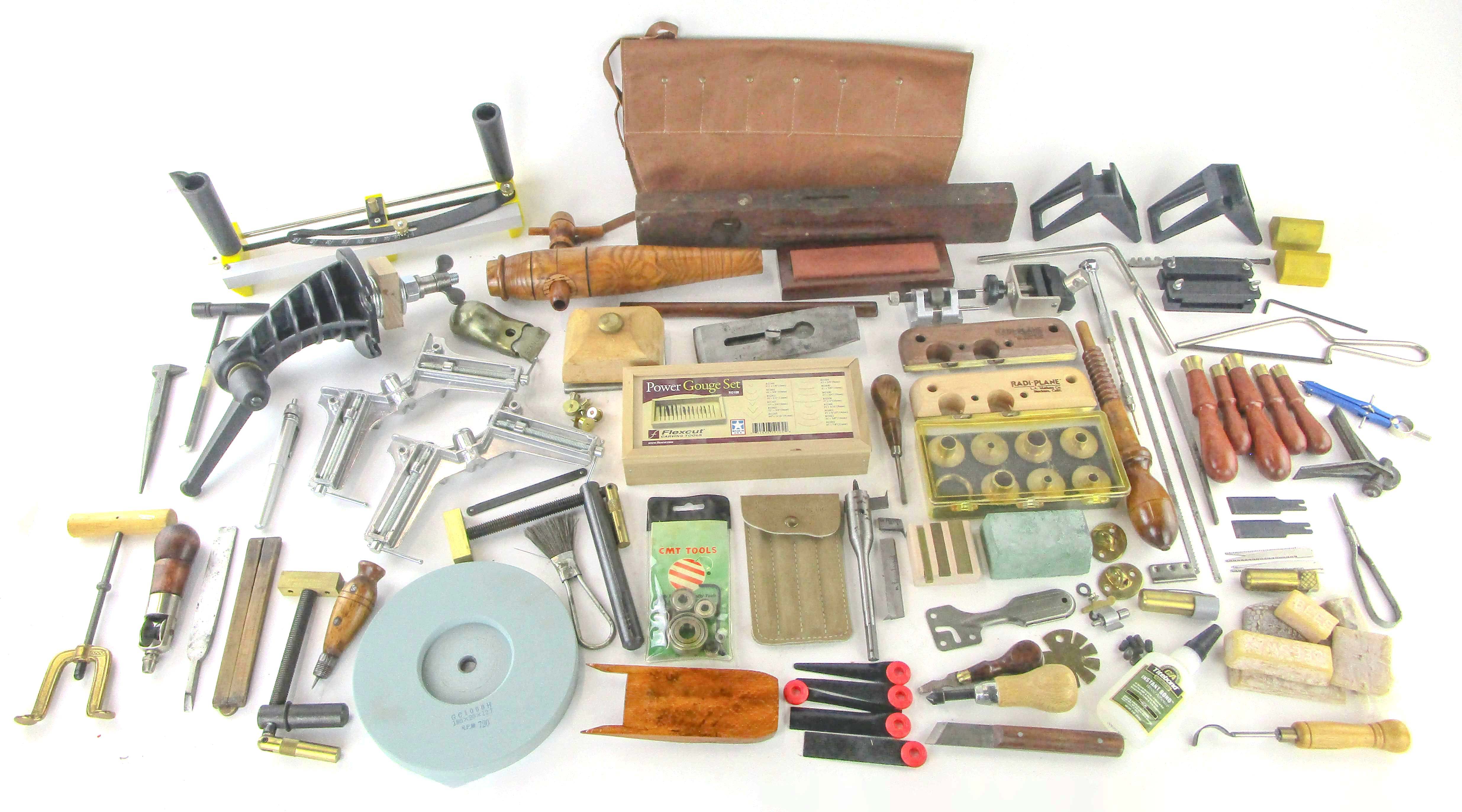 WEB12-374 DEALER LOT. CARVING TOOLS AND MISCELLANEOUS TOOLS INCLUDING STANLEY NO. 104 LEVEL WITH WET VIAL, VERITAS BEADING TOOLS AND CARVER'S VISE, RADI-PLANES, SHOP FOX, SPYDER CO CERAMIC FILE SET IN CASE, SHARPENING STONE, USER MADE LEATHER FILE CASE. (KLY037)