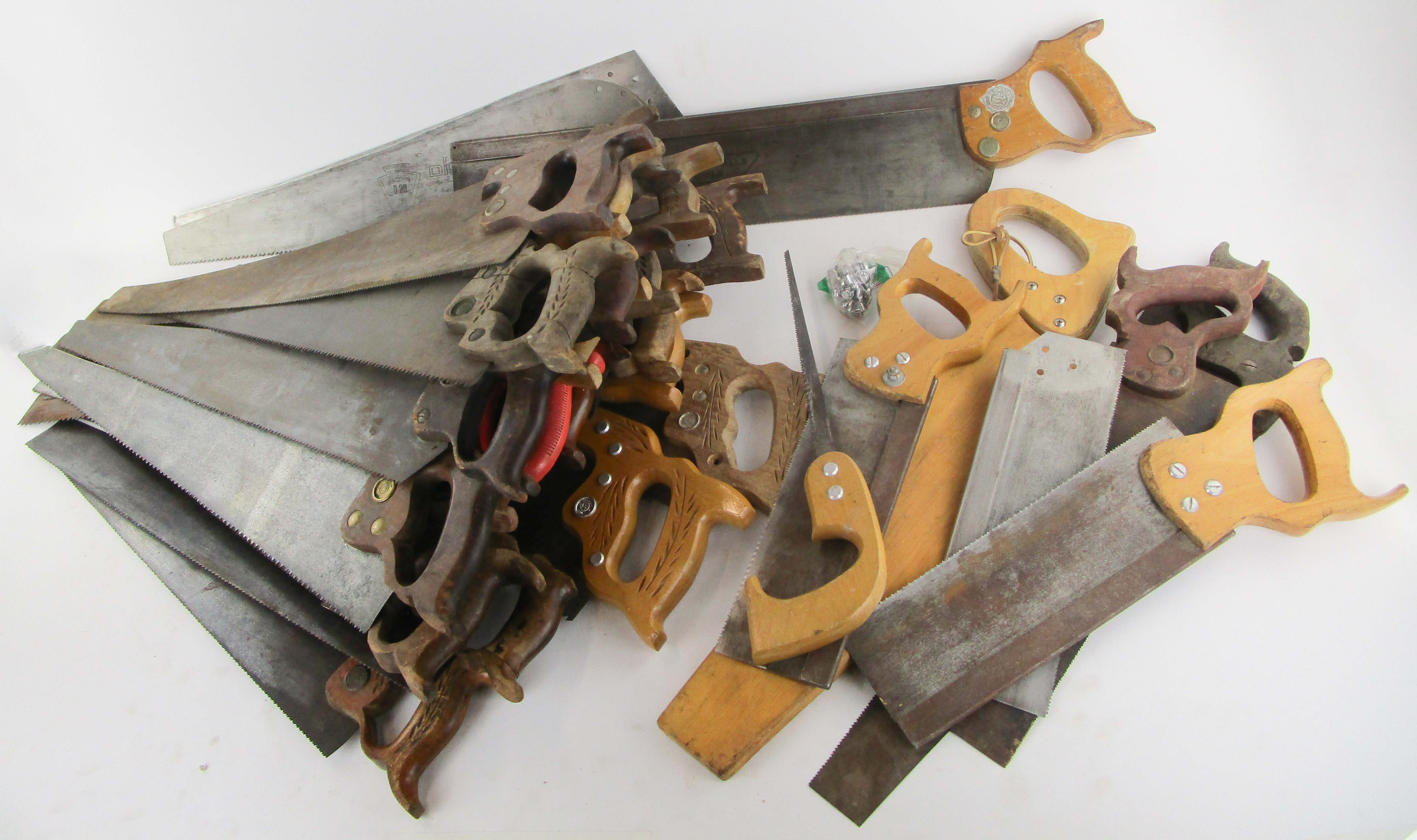 WEB12-392 DEALER LOT OF SAWS. Thirty-two total. 10" thru 26" blades. Includes some Stanley, Disston, Millers Falls, and most unmarked. Plus bag of nuts, modern. (BLN058)
