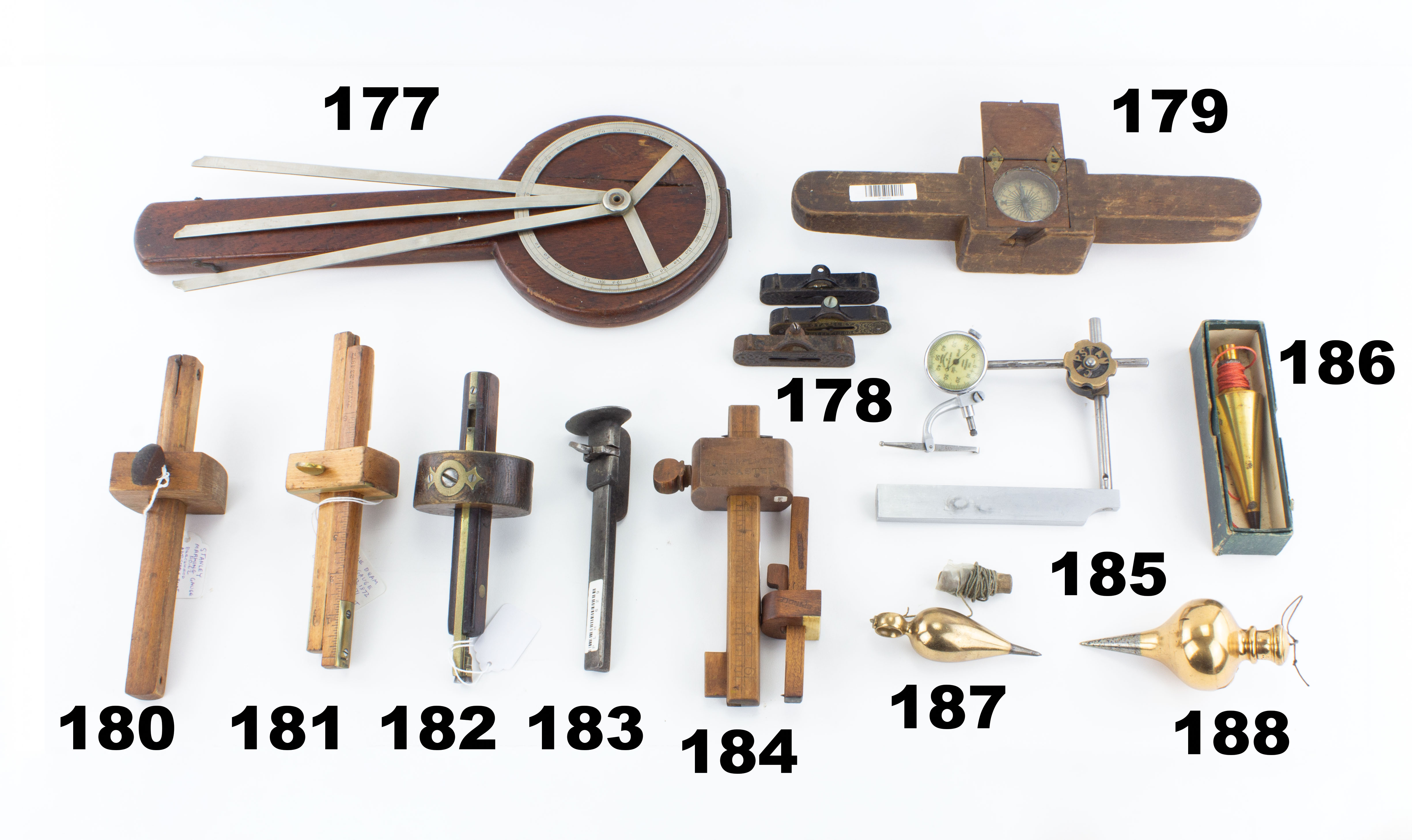 7501-184 Lot of two marking gauges. One by E.W. CARPENTER with sliding boxwood point on ruled stem, clear mark on head. The other is user made, 5" long with wedge-locked head and bone wear plate on head. Good+ (SPM3104) 40-80