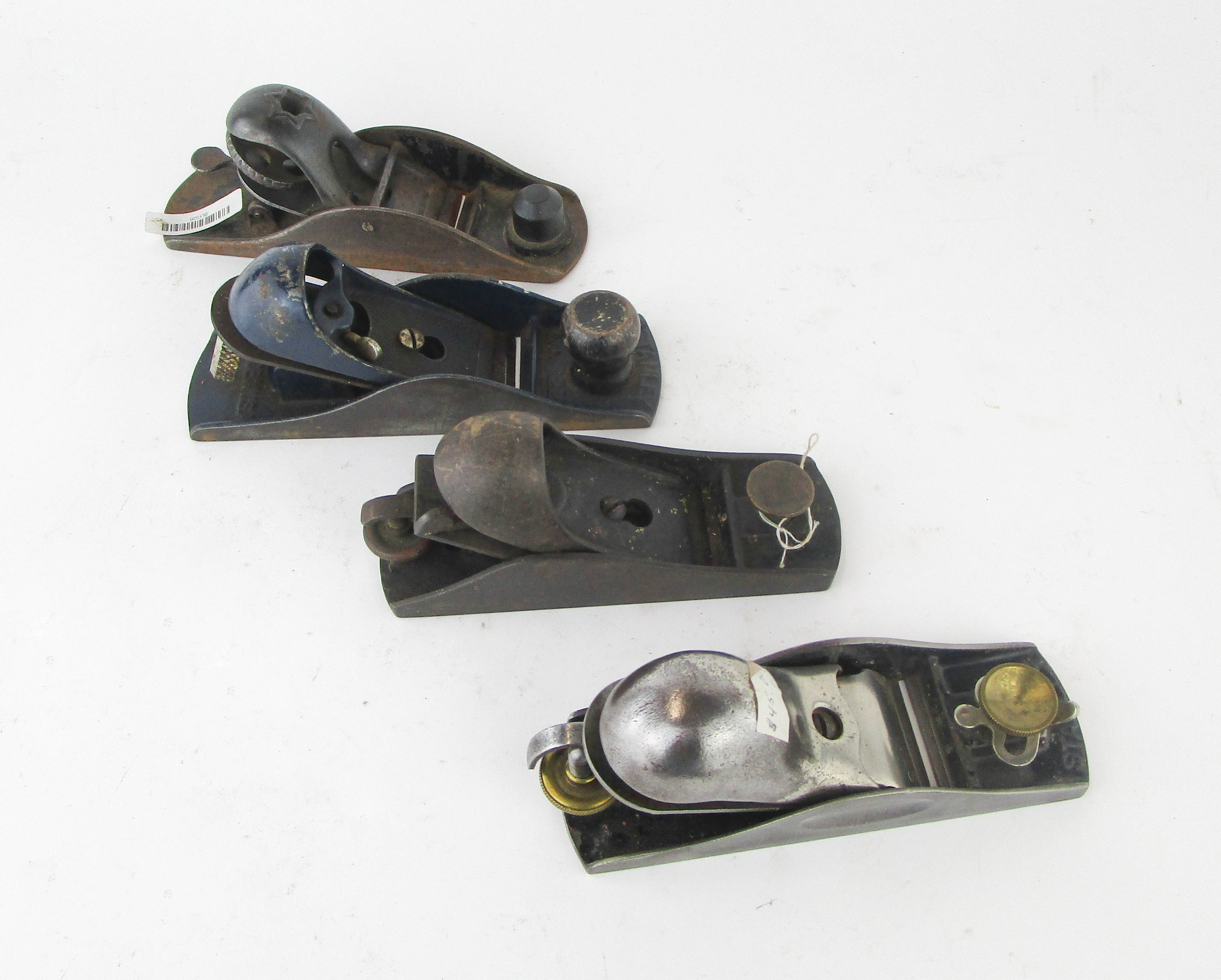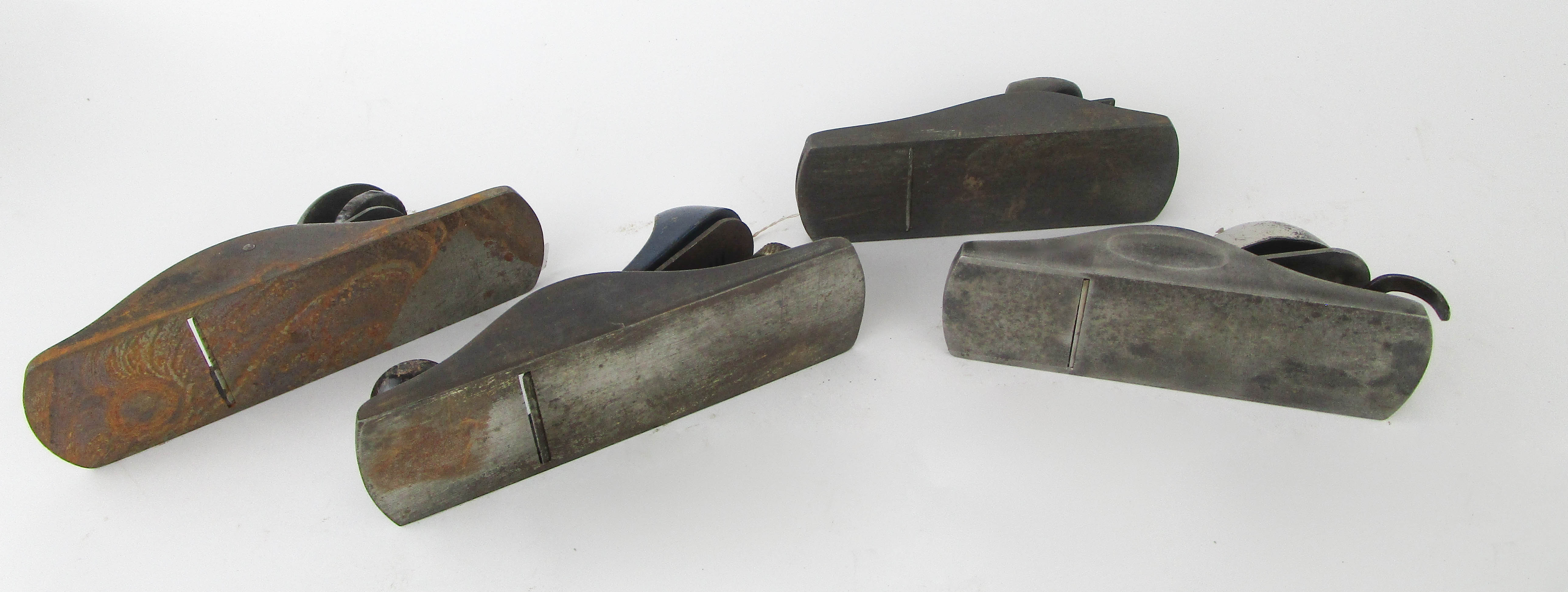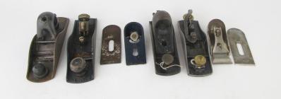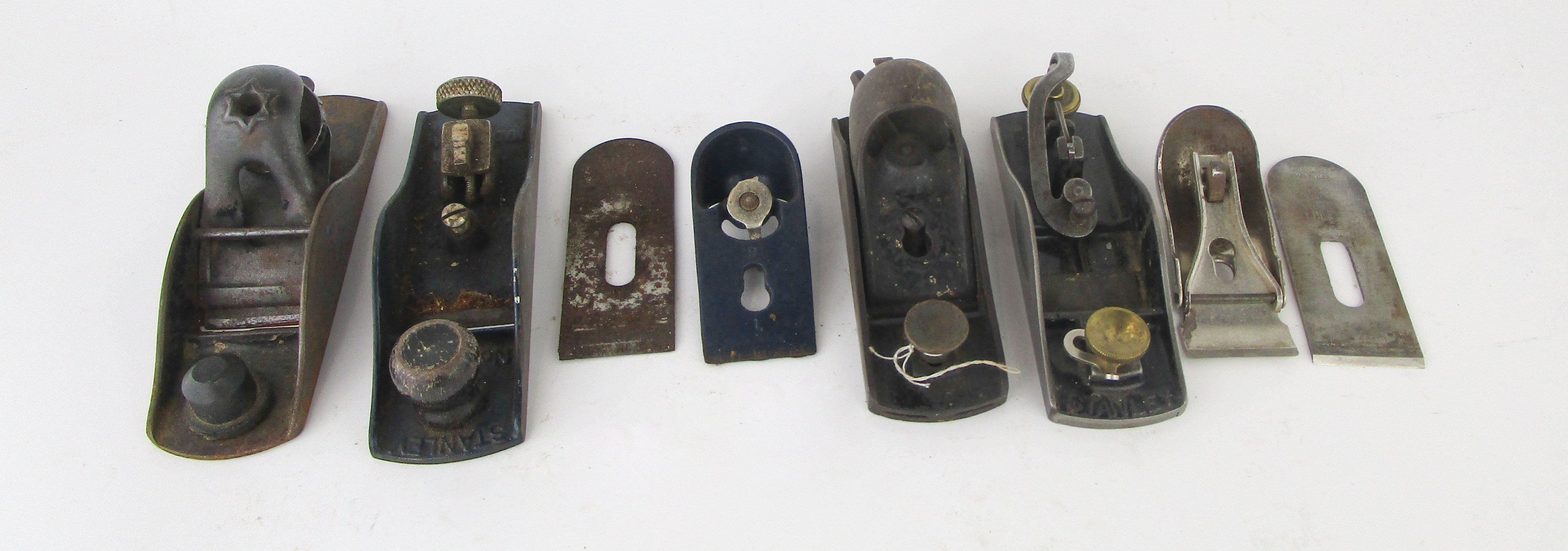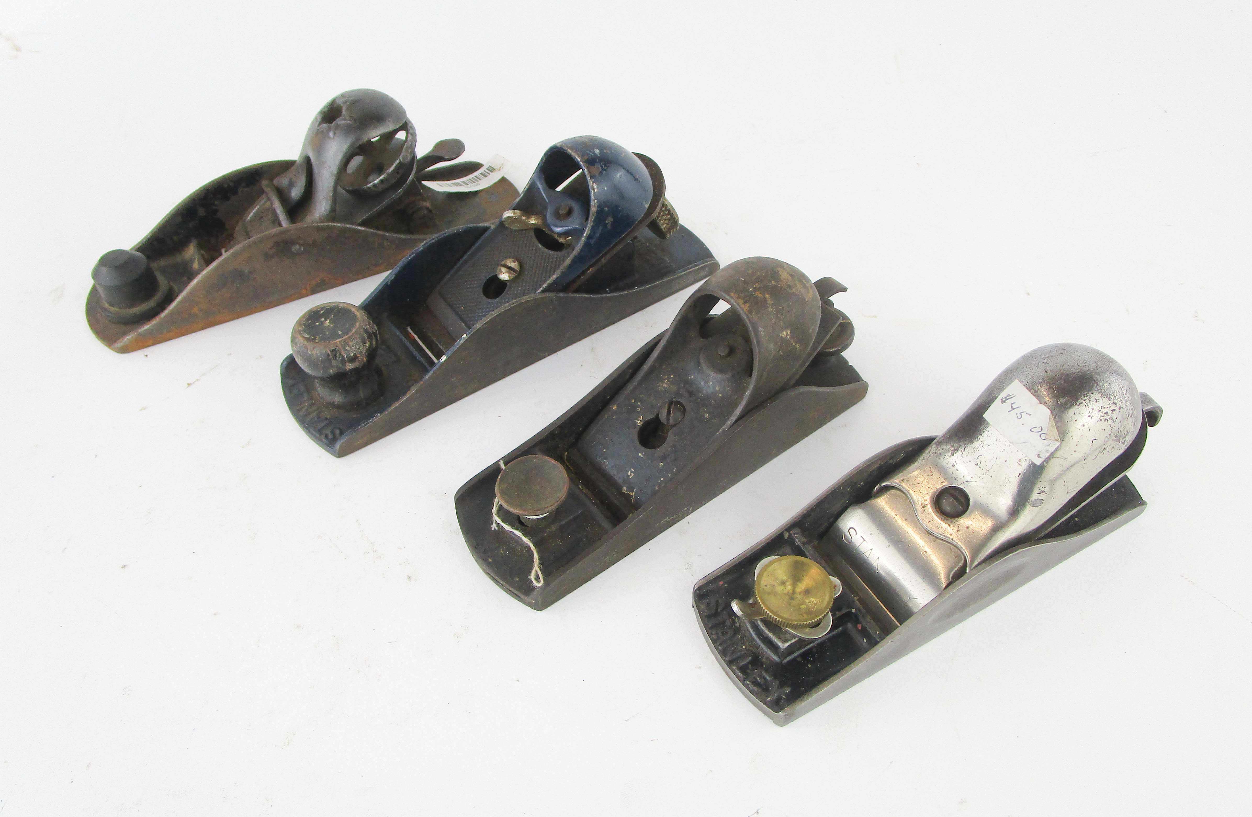 WEB12-107 LOT OF FOUR BLOCK PLANES. One Stanley No. 220, one Stanley with 6-1/4" sole and 1-1/2" cutter. Two unmarked with 6" soles and 1-3/4" cutters. (BLY526)