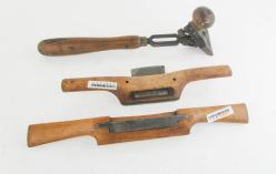 WEB12-370 LOT OF TWO WOODEN SPOKESHAVES AND STANLEY NO. 82 SCRAPER MISSING CUTTER.
