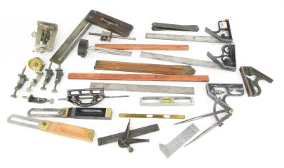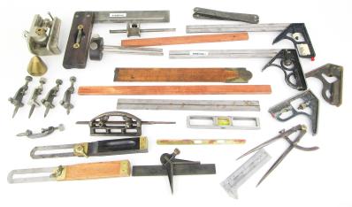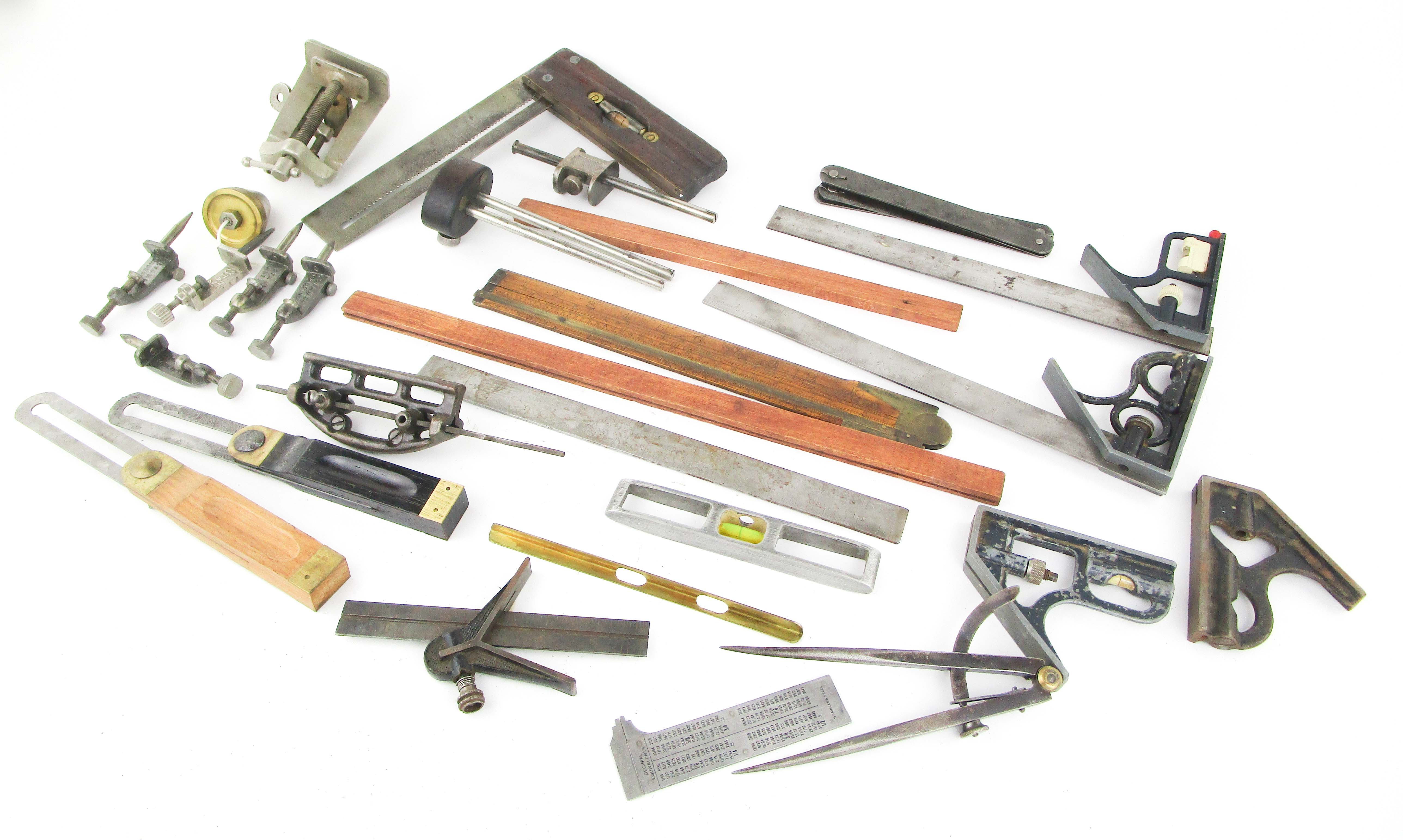 Web11-153 DEALER LOT OF MEASURING TOOLS. Twenty-three pieces total. Two 8" Stanley Bevels No. 25, two Stanley Marking gauges No. 97 & 198, five Stanley trammel points; couple say Stanley No. 4, two 4" rule attachments; one missing it's screw, Craftsman aluminum rule No. 39555, one L.S. Starrett No. 4 grad. with attachment, wing calipers 6-1/2" long, L.S. Starrett No. 451 Zig Zag rule, 2" brass plumb bob, small 6" aluminum rule vial good, The Executive Pocket Chum combination rule, a file with attachment 8", dowel jig Stanley No. 59, combination square 10" blade vial good, two wood sticks 12-1/2" and 16-3/4" long, sliding folding rule W.H. Brown Co. (WHE421)