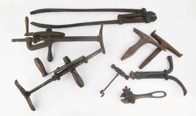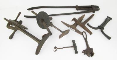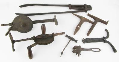 Web11-614 DEALER LOT OF MISCELLANEOUS TOOLS. Hardy anvil, ANVIL HARDY 8 x 8" with "PS" touchmark; 29" cast iron snips; 9" cast iron hook marked patent applied for; two breast drills; C. J. Capewell adjustable wrench; and a 7" tooth extractor. (PLH4301)