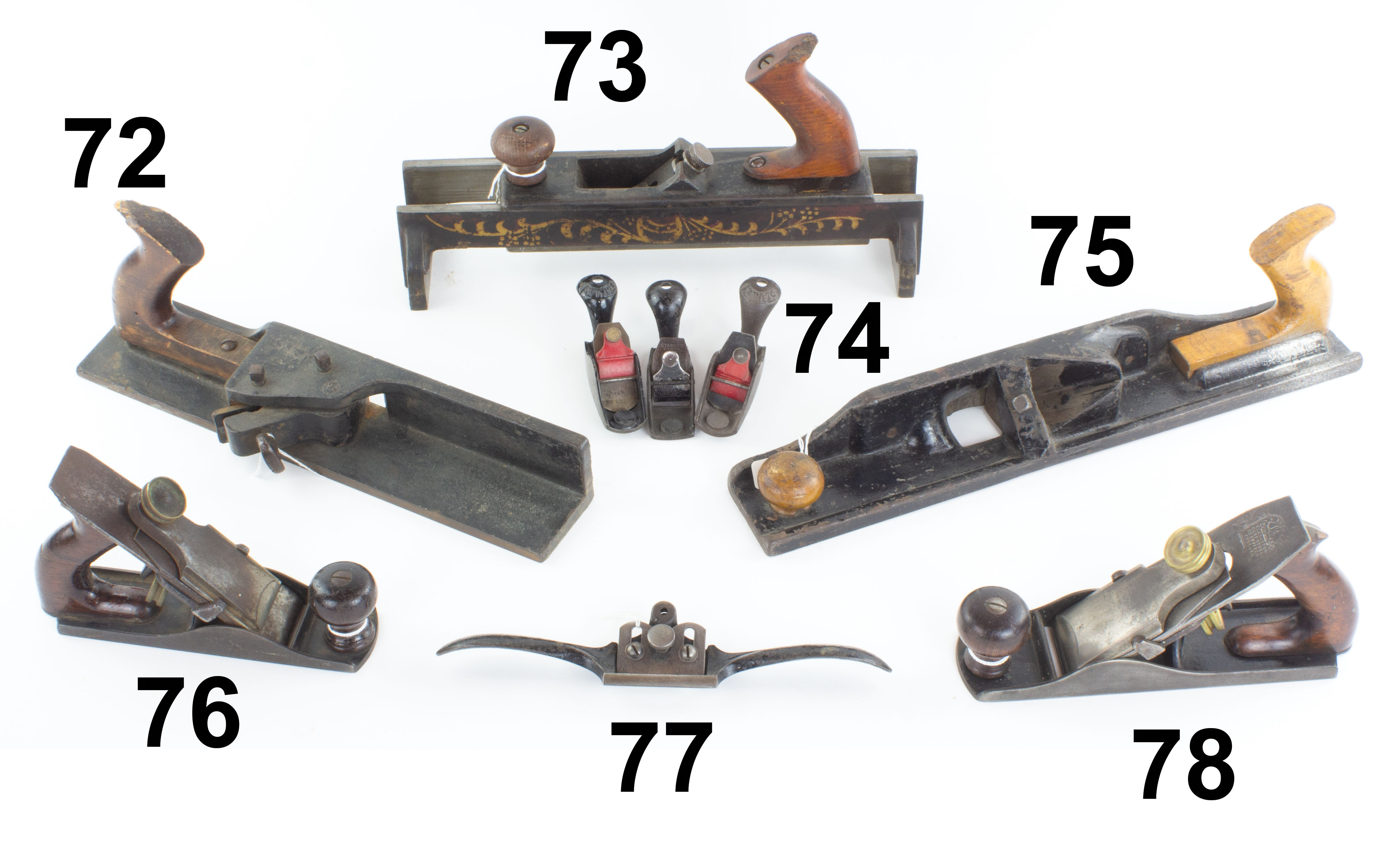 7502-73 Print block trimming plane. Unmarked plane with 10" sole, original track with gold pin striping. One large chip from rear of metal body and one chip from end of tote. Wood and metal otherwise clean. Good (HUH294) 75-100