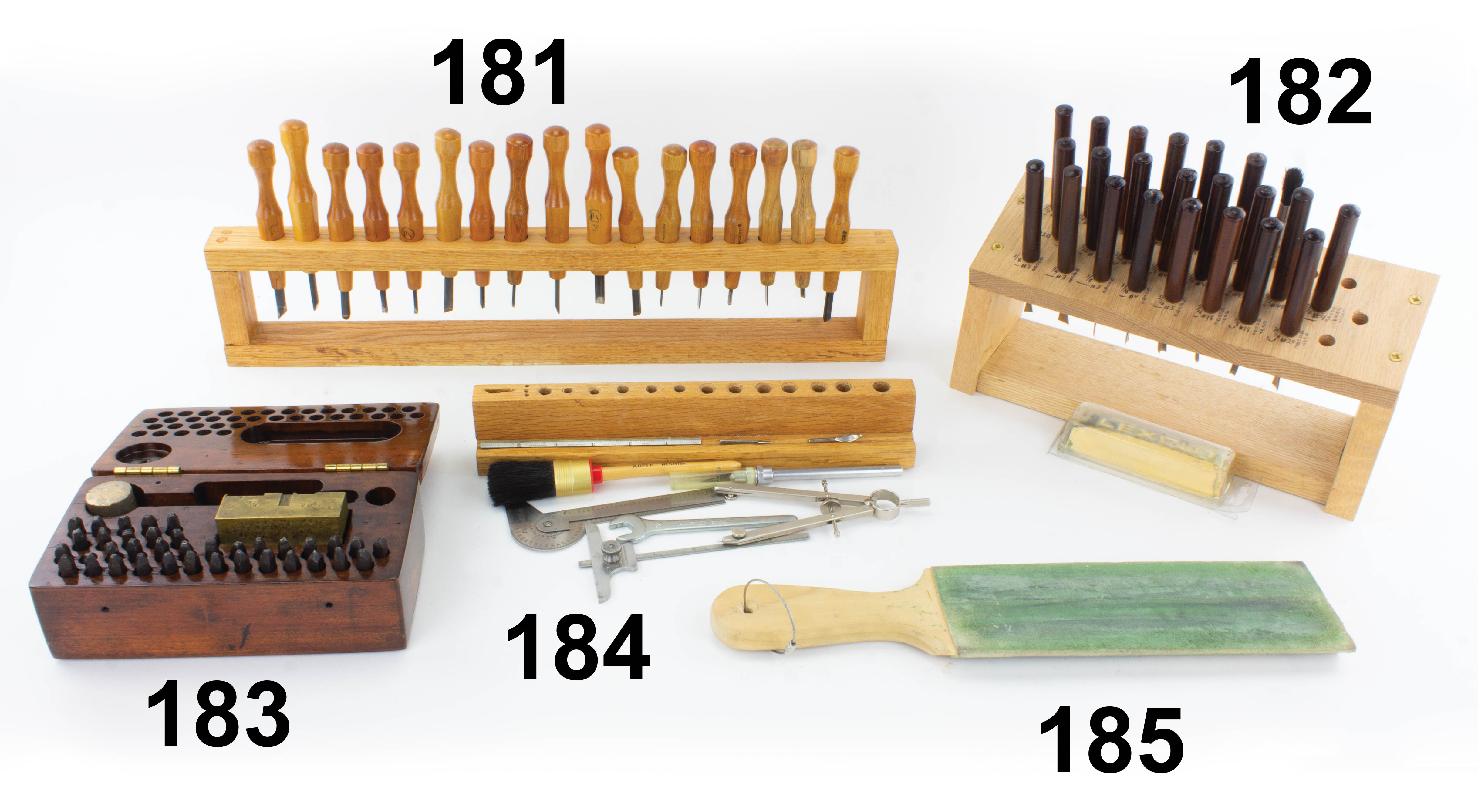 7502-183 Set of letter and number stamps. 37 total including both letters, symbols, and digits. W with broken off striking end and shorter (and you can always use the M in its place). 1/8" size, inside polished wood box that also includes a brass handled mallet and a brass swage block. Unmarked. Good+ (KLY015) 50-100