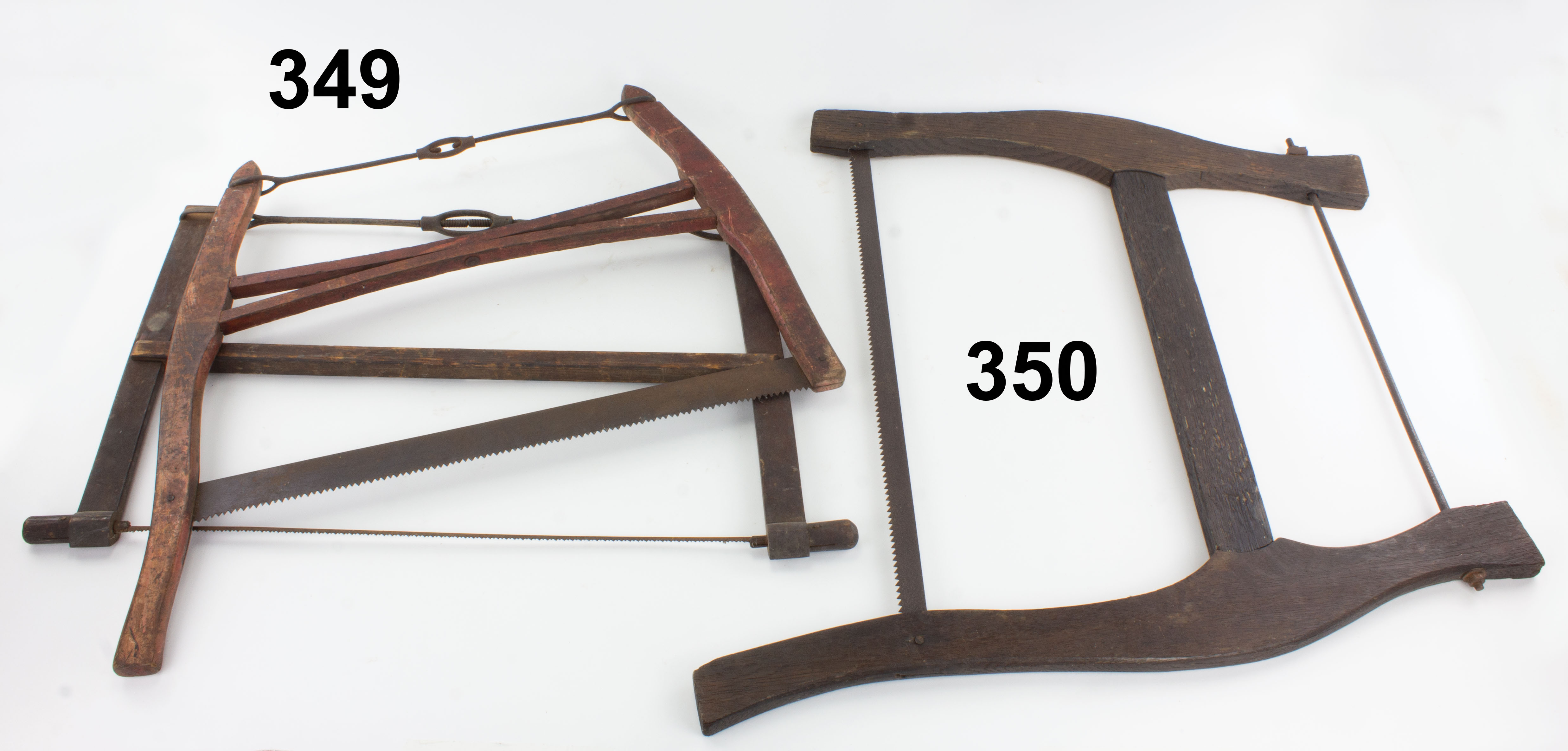 7502-349 Lot of two bowsaws. One is 22-1/2" x 15" with 20" blade with 9ppi, and iron tension rod and toggle. The other is 25" x 21", painted red, 20" blade with 6 ppi, and iron tension rod and toggle. Both have overall wear and some surface rust. From the collection of John Lervoog. Good (PBU406, 407) 35-70