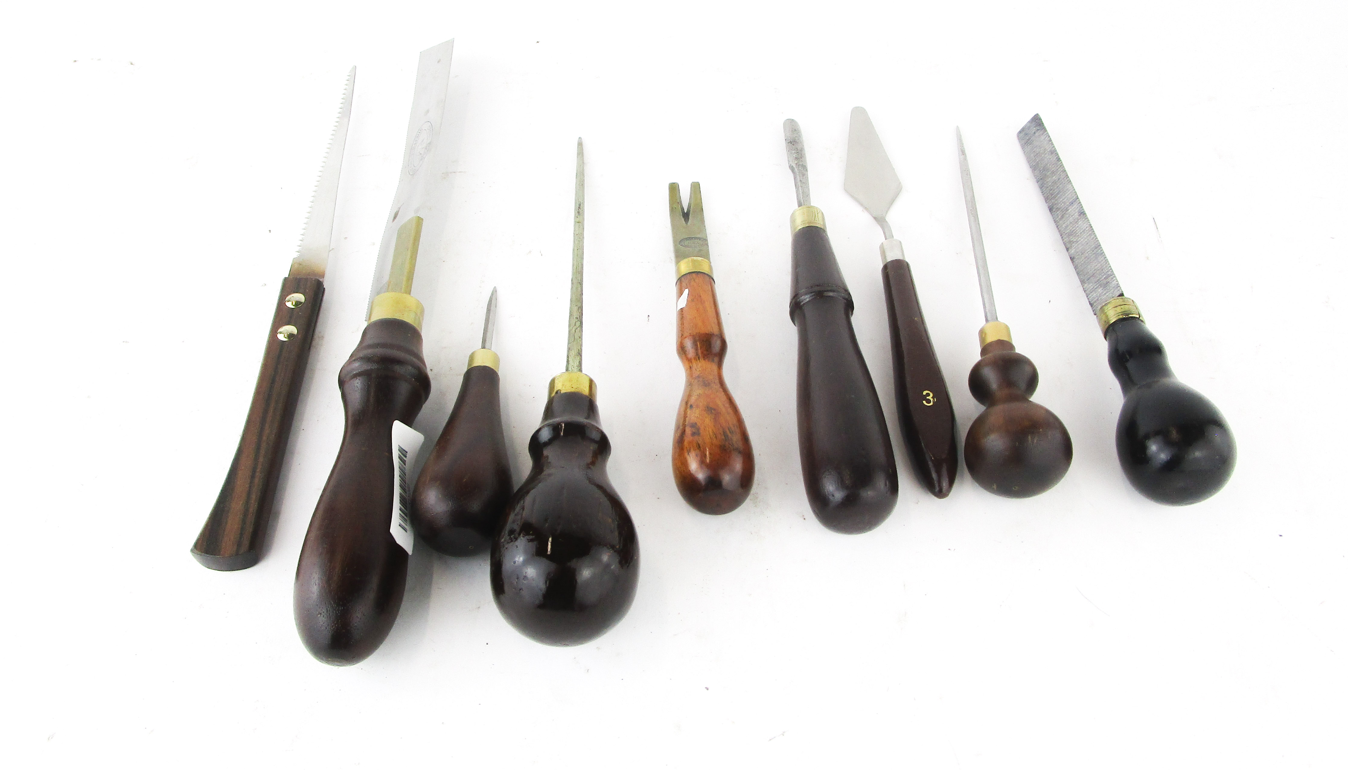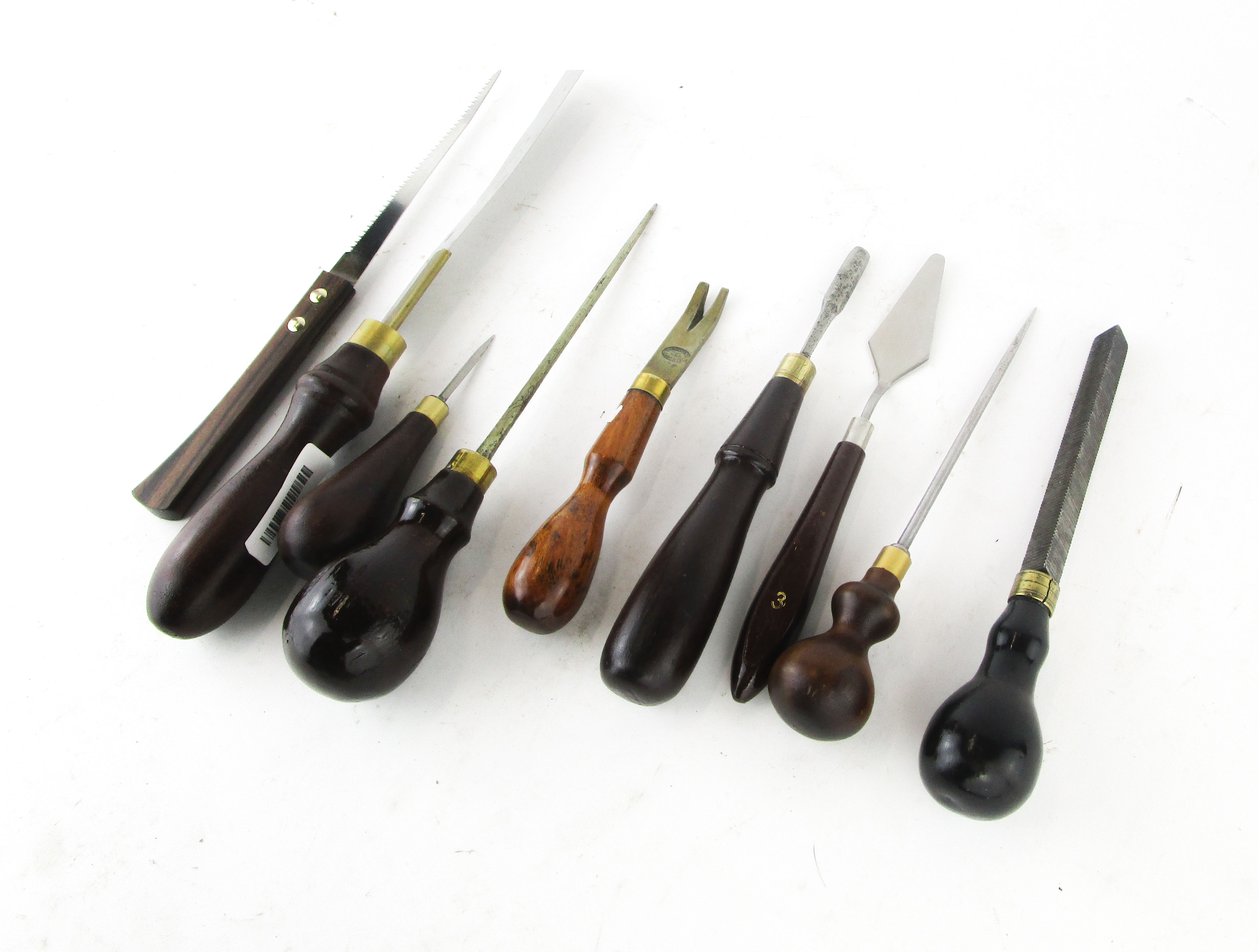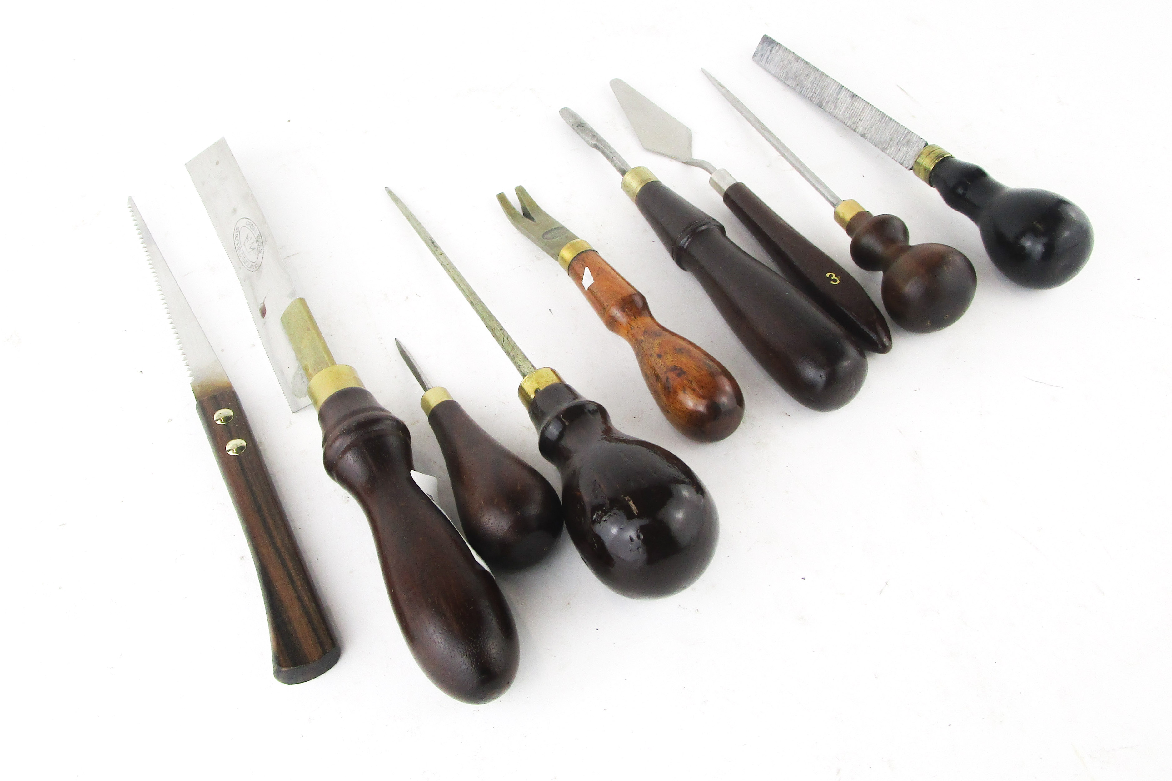 WEB12-33 LOT OF NINE EDGE TOOLS. Three scratch awls, one triangular float, two saws including one by Crown Tools, painters trowel, J & M Brothers gauge, and Sargent nail pullers. 4-3/4" to 11-1/2". Handles relaquered. (KLY066)