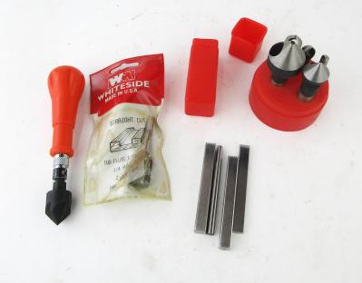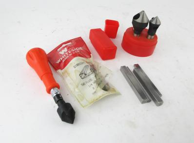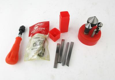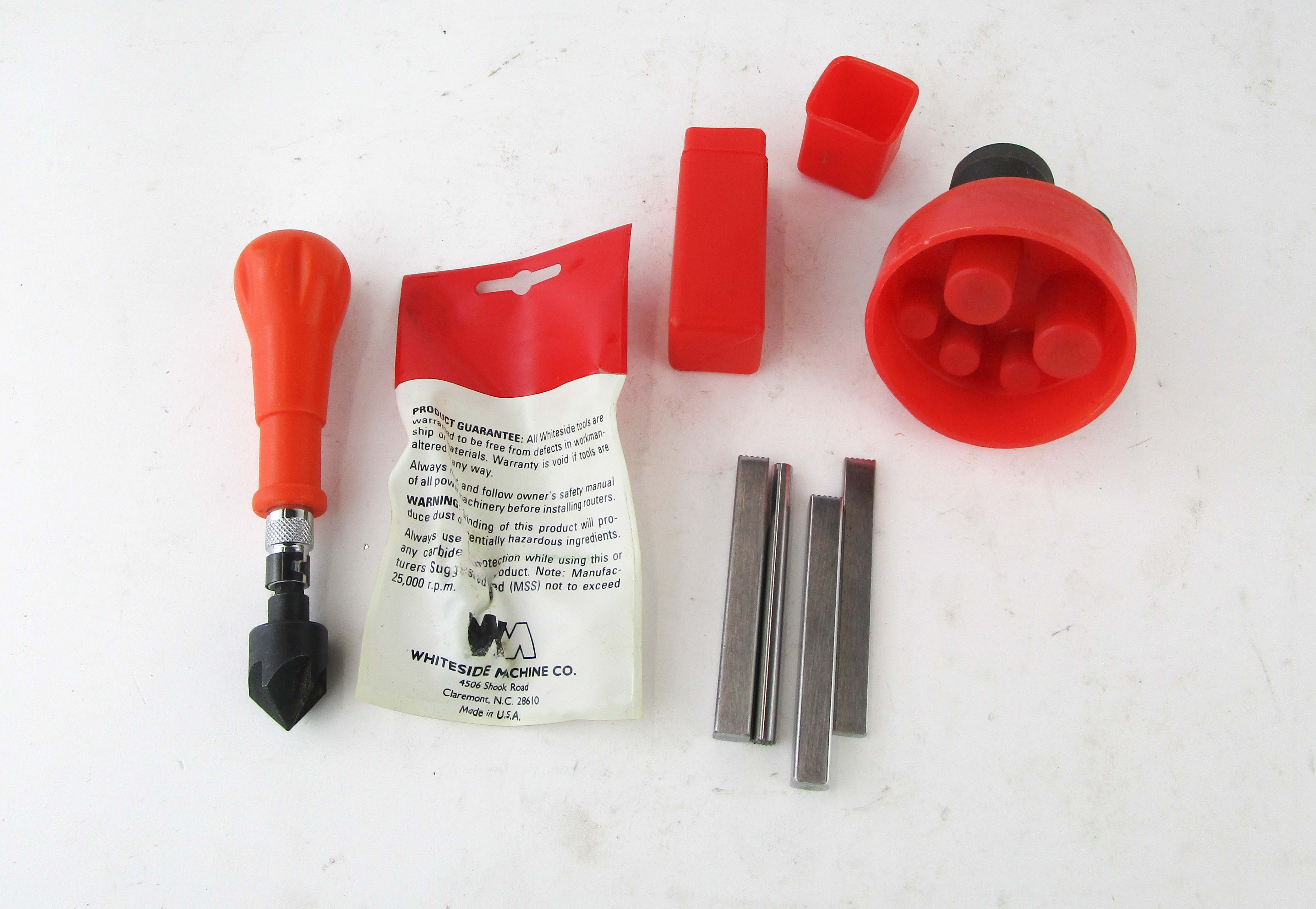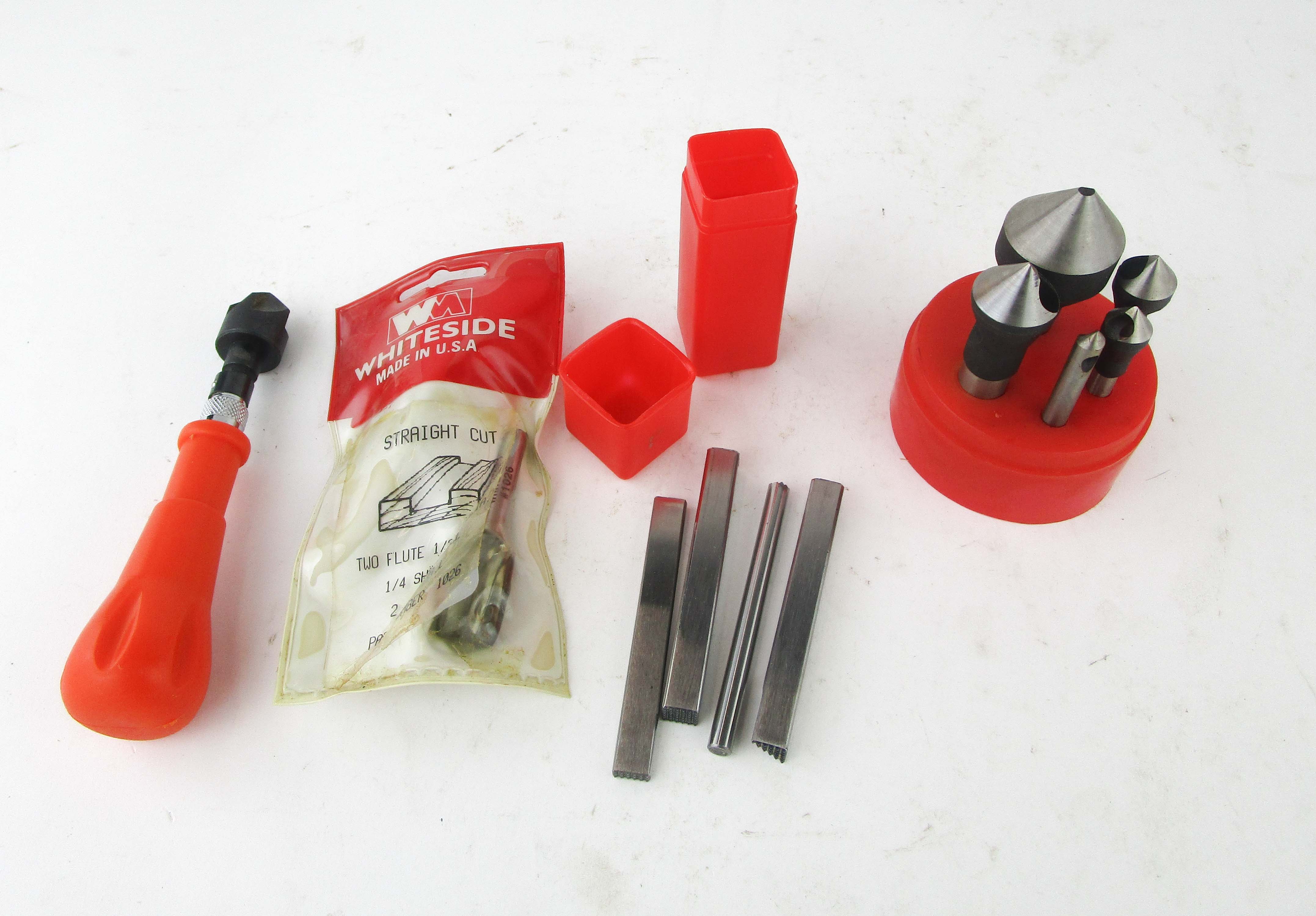 WEB12-34 LOT OF FOUR MODERN TOOLS. Four stamps, a set of bits, orange tool handle with bit, and one Whiteside straight cut flute bit in original packaging. (KLY060)