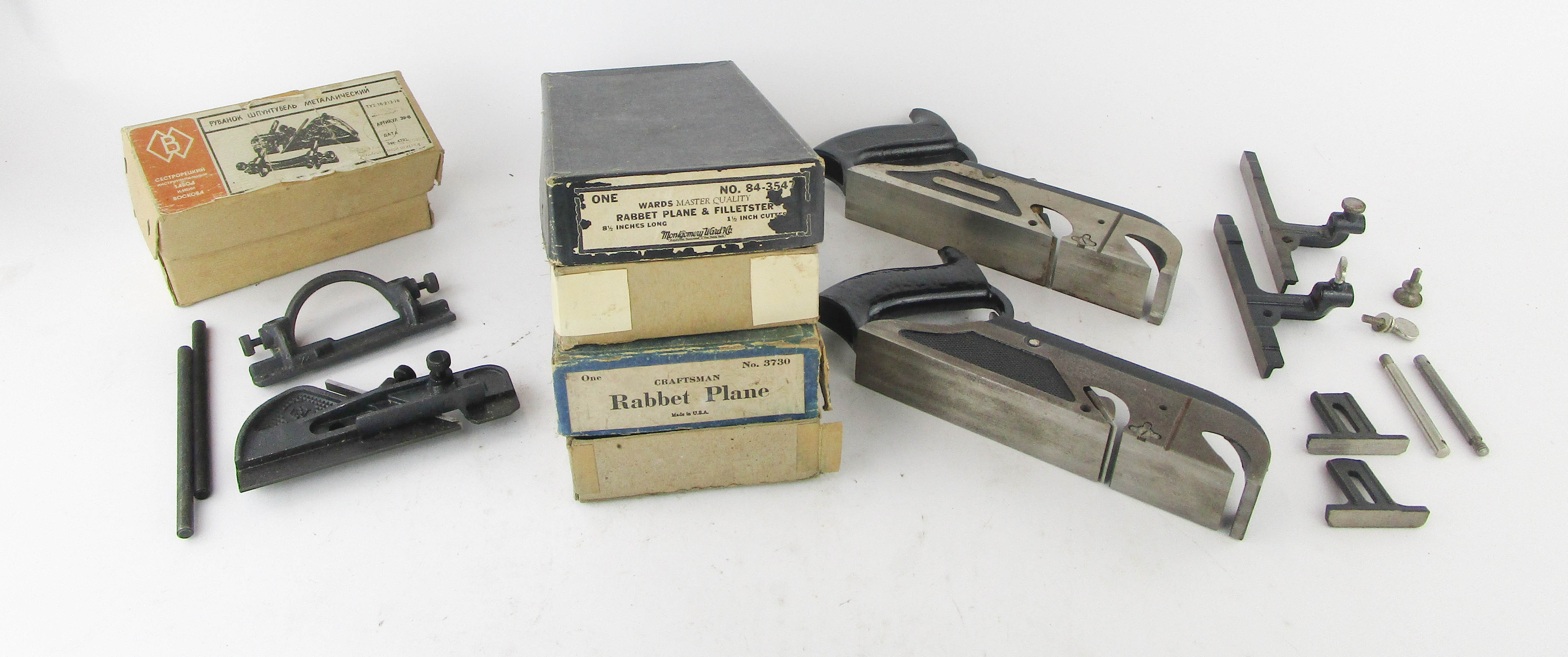 WEB12-92 LOT OF THREE PLANES IOB. . One Wards Master rabbet & filletster No. 84-354, and one light plow plane Russian (?), and one Craftsman rabbet plane No. 3730. (BLY537)