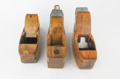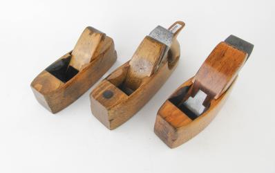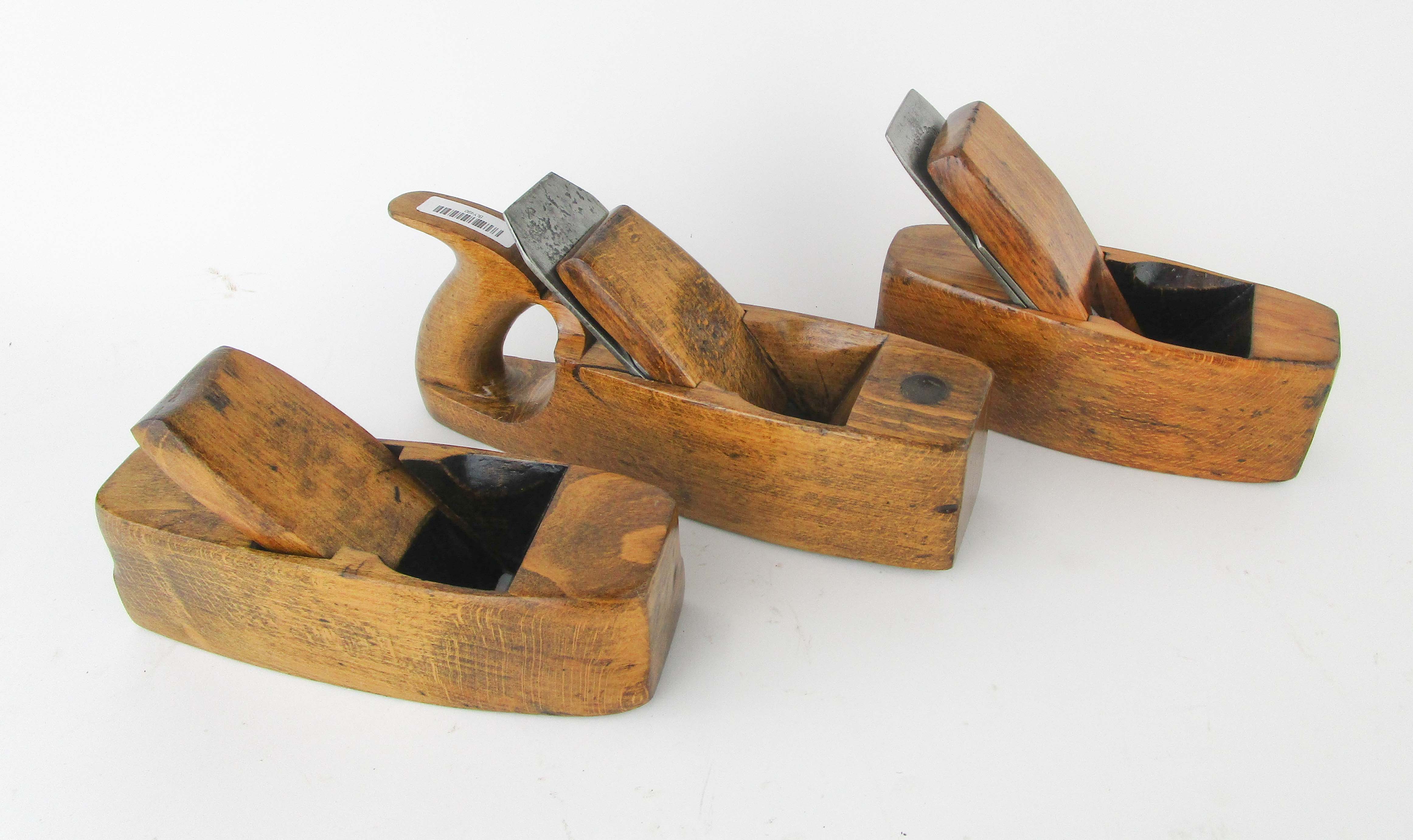 WEB12-143 LOT OF THREE WOOD COFFIN PLANES. All unmarked. One missing cutter and 8" sole; One handled with 10" sole and 2" cutter; and coffin plane 7-1/2" sole with 2-1/4" Sandusky Tool Co. cutter. (BLY490)