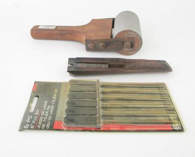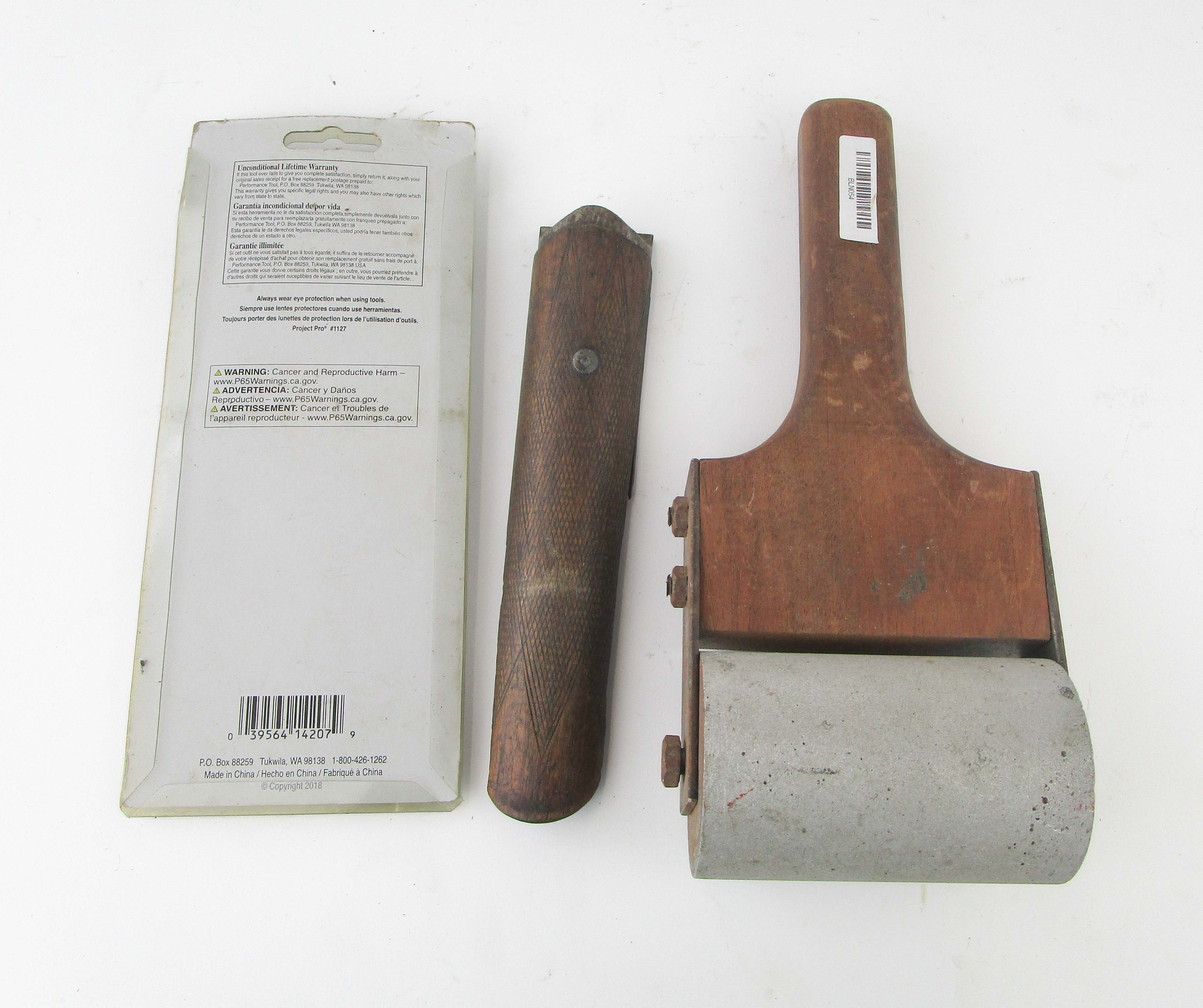 WEB12-147 LOT OF THREE MISCELLANEOUS TOOLS. Roller with 4" rolling head, 10" overall; wooden nail puller approx. 8" long; and 6pc file set 6" made by Project Pro. (BLN054)