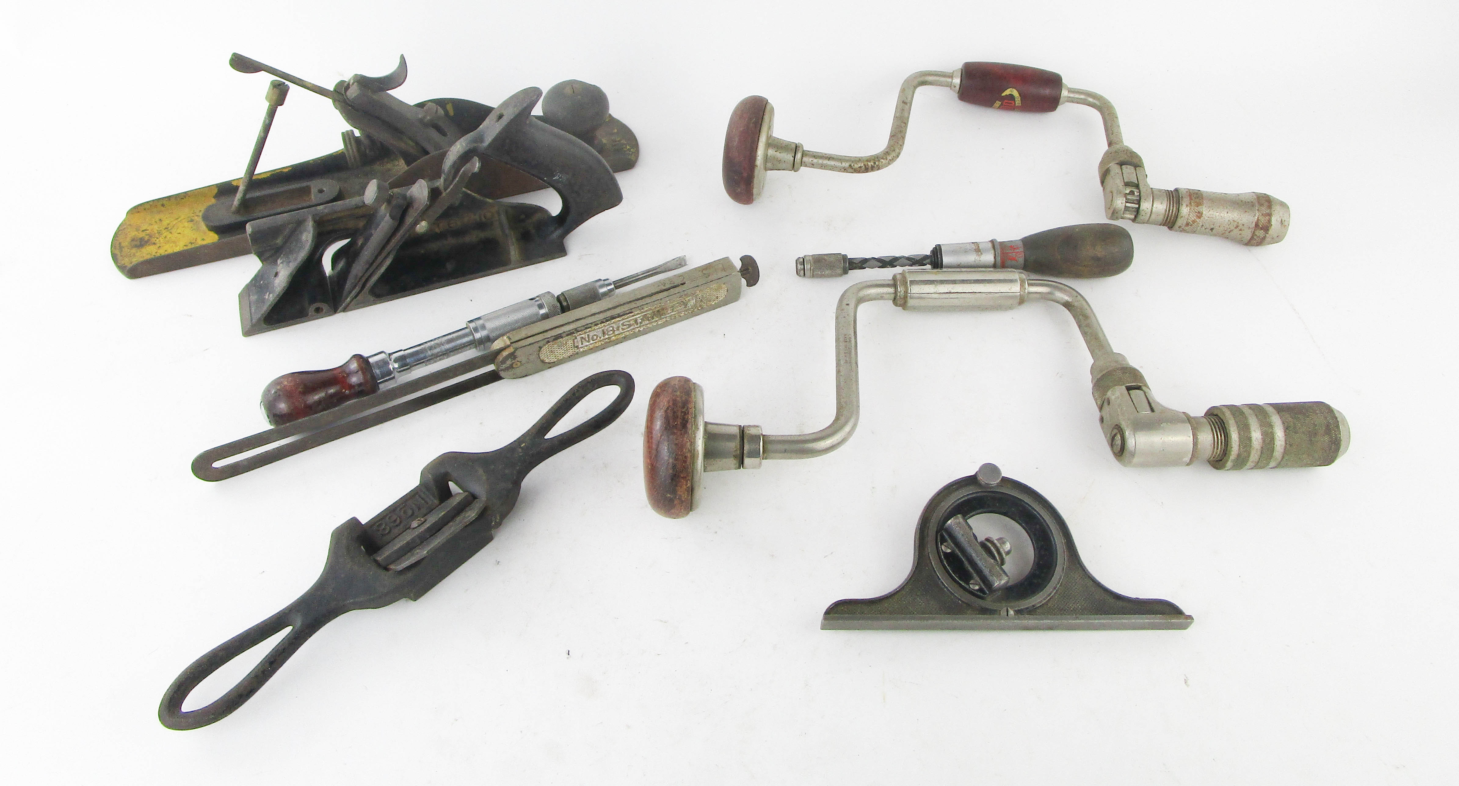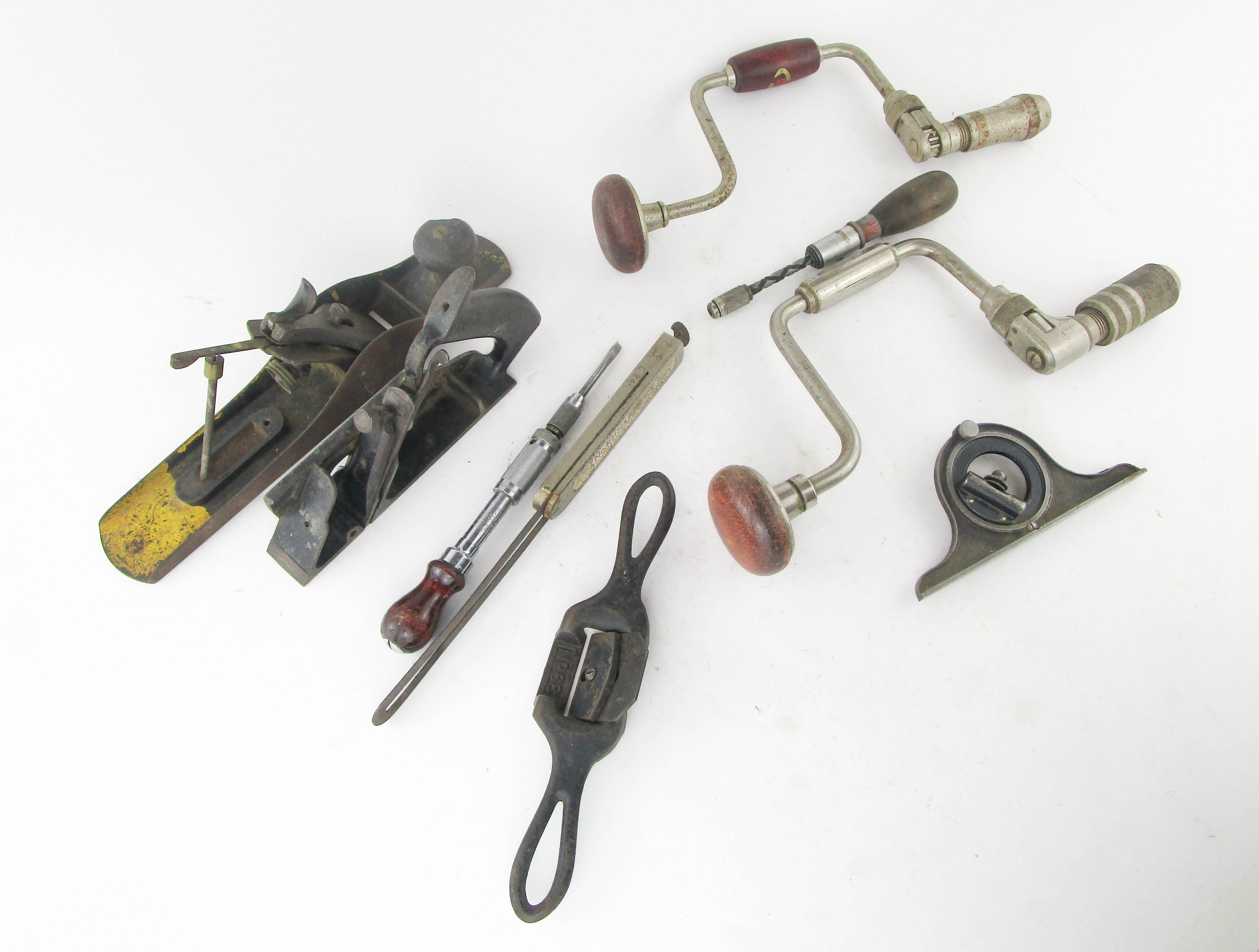 WEB12-375 DEALER LOT OF MISC TOOLS. . Two braces, one Craftsman and one Dunlap; two planes including Stanley No. 78 modified and jack plane missing cutter and tote. Two push drills including Stanley Handyman No. 133H and a Millers Falls No. 670A. Stanley No. 18 bevel with 12" blade. Center finder head with dry vial and Stanley No. 68 spokeshave. (THS200)